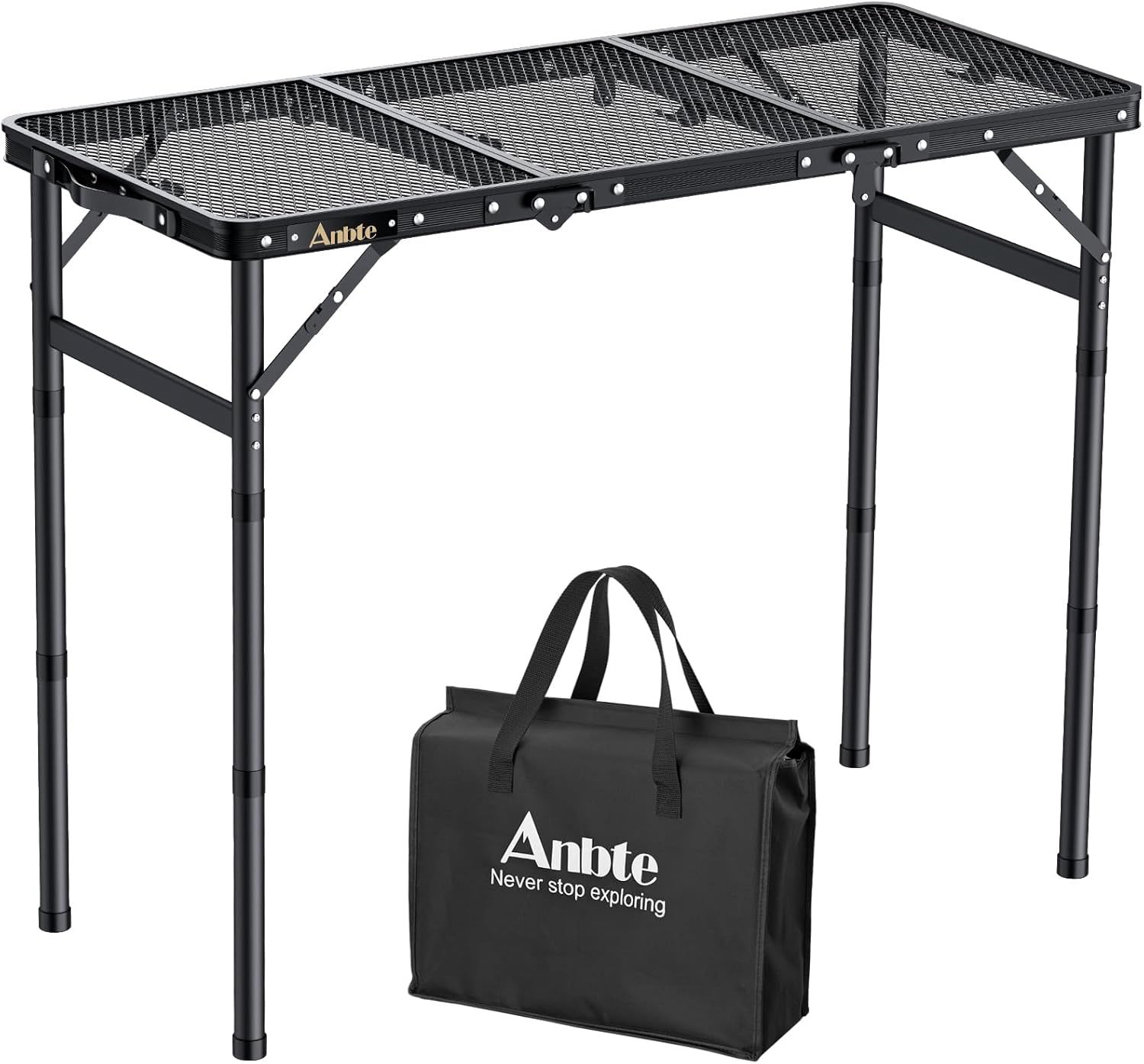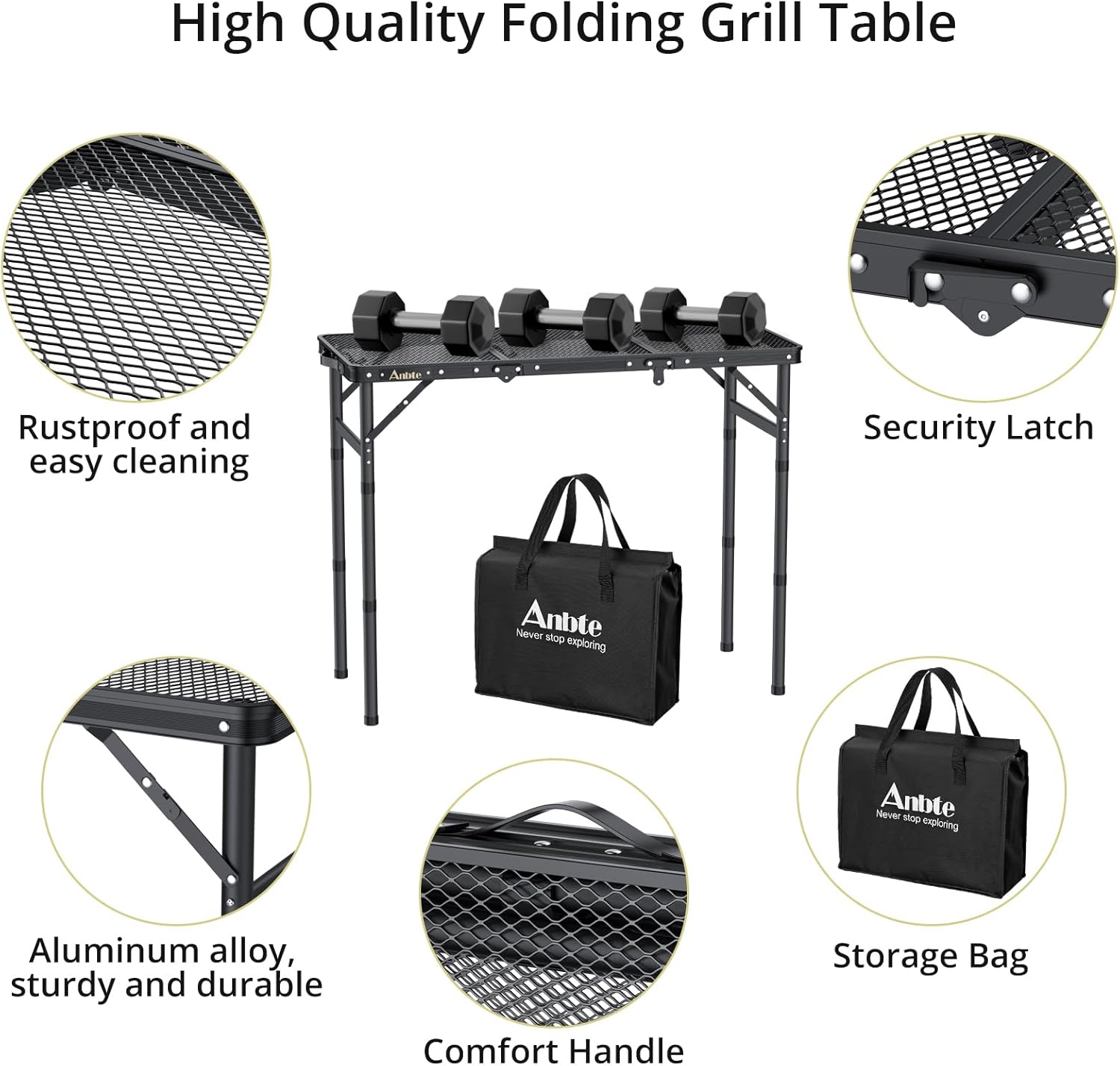 Premium Quality Material, Stable and Sturdy: Anbte outdoor grill table is made of updated and thickened aluminum frame, very durable. Side snaps secure the tabletop in place and keep it level. U-shaped frame improves the stability of the table