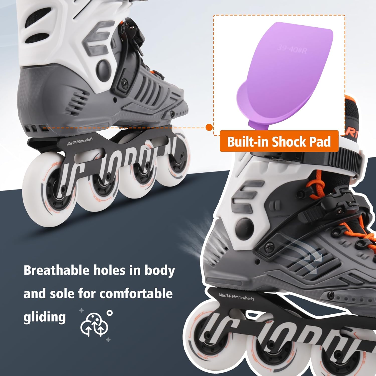 QUADRUPLE PROTECTION SYSTEM—The adult inline skates have hardshell, locking cuff buckle, micro adj 45° buckle, lace closure system provide a secure fit that adapts to your foot shape and offers enhanced ankle support and reduces the risk of injury, keeping you safe while skating.