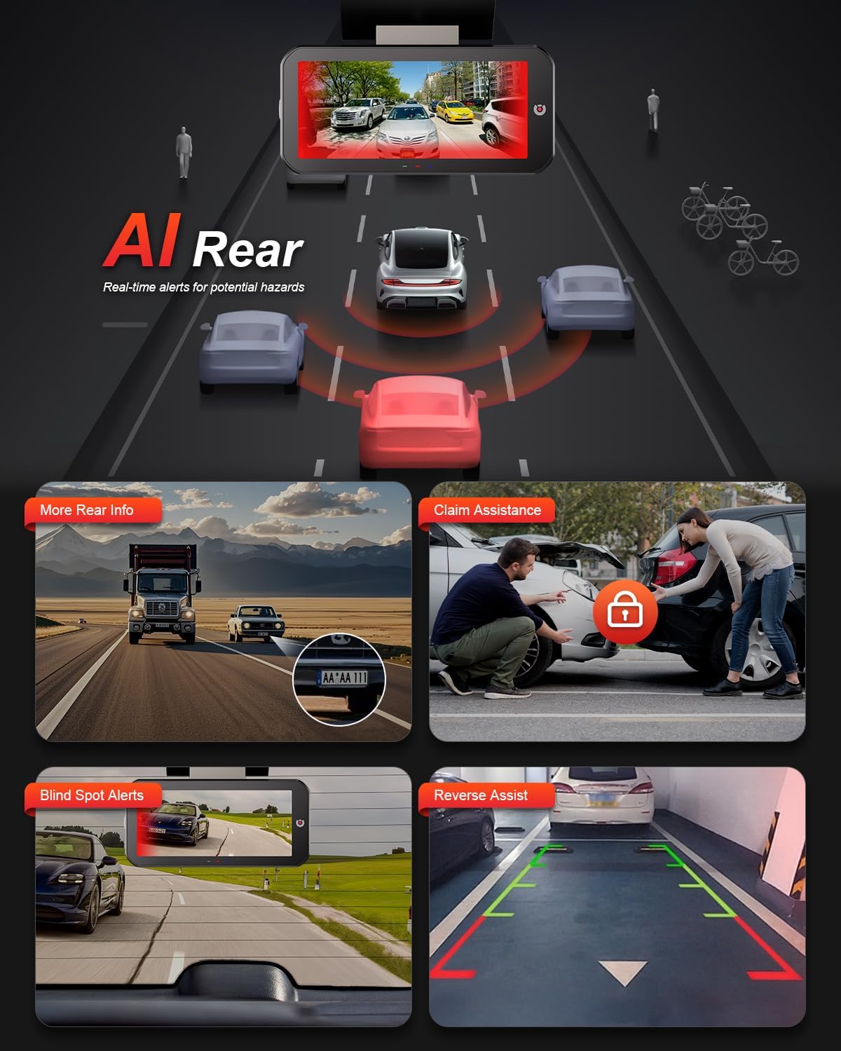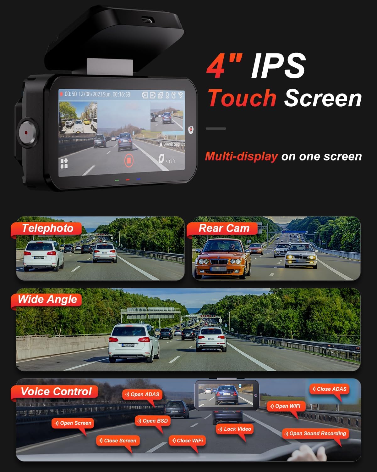 【Intuitive Control with Voice & Touchscreen】 The 4-inch IPS HD touchscreen allows you to view three screens at once or focus on a single camera. Use voice commands to capture stunning moments hands-free while driving, ensuring your focus stays on the road. The EYES dash cam seamlessly combines technology and convenience to make every drive memorable.
