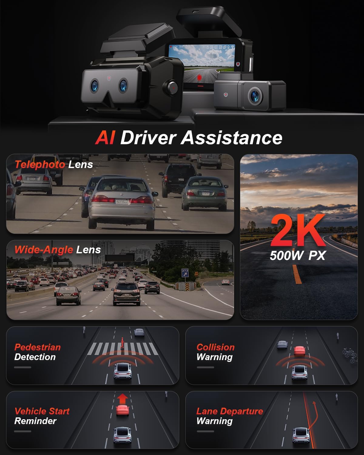 【See More with World’s First Telephoto & Wide-Angle Lenses】 Equipped with both a 2K telephoto lens and a 2K wide-angle lens, this dash cam lets you capture critical details from every perspective. The telephoto lens records license plates, road signs, and pedestrians at a distance, while the wide-angle lens covers more of your surroundings. This combination provides comprehensive video evidence, giving you a clear advantage in case of accidents or disputes.