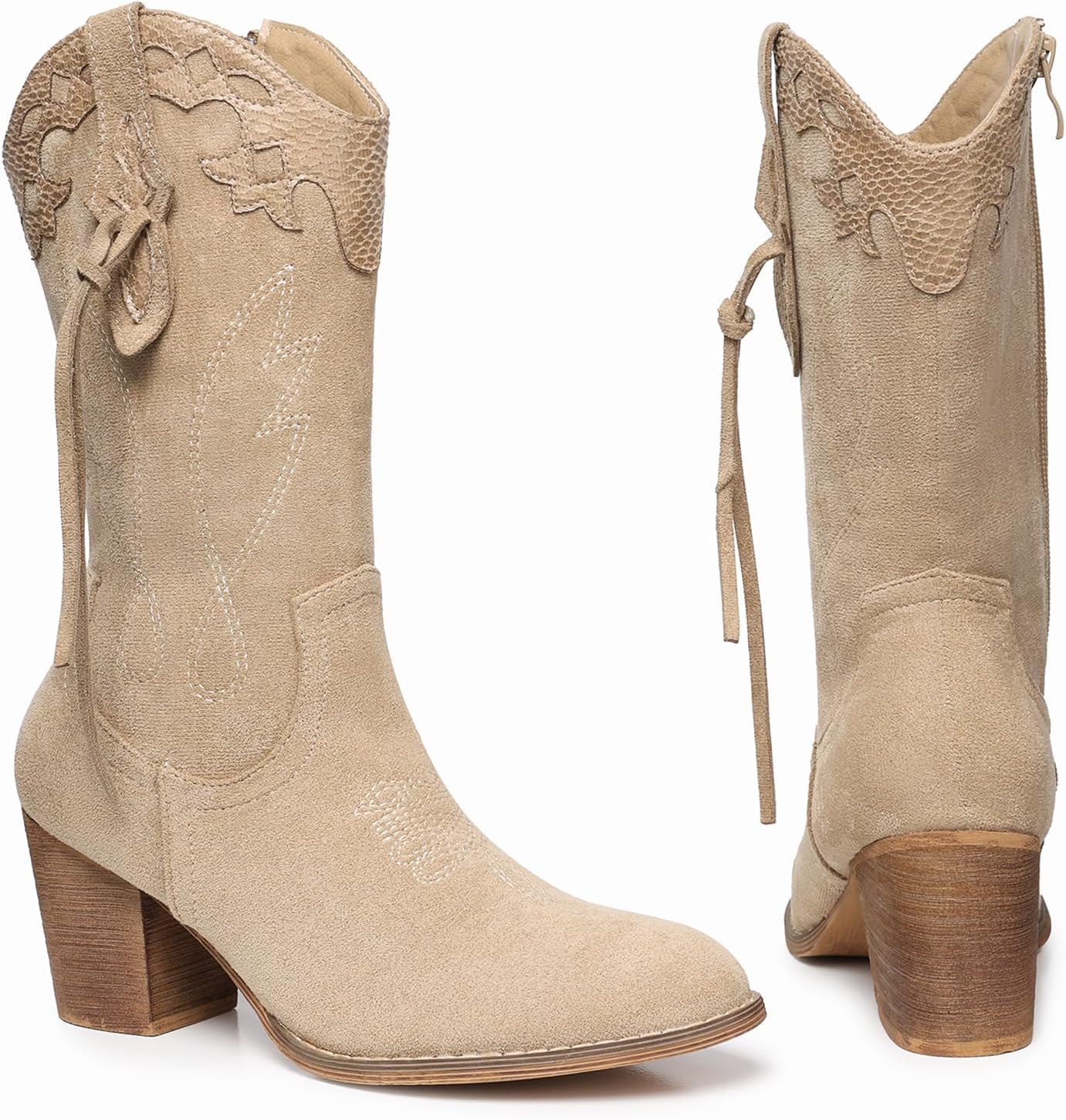 SHIBEVER Cowboy Cowgirl Boots for Women: Western Country High Heel Boots Suede Zipper Mid Calf Booties