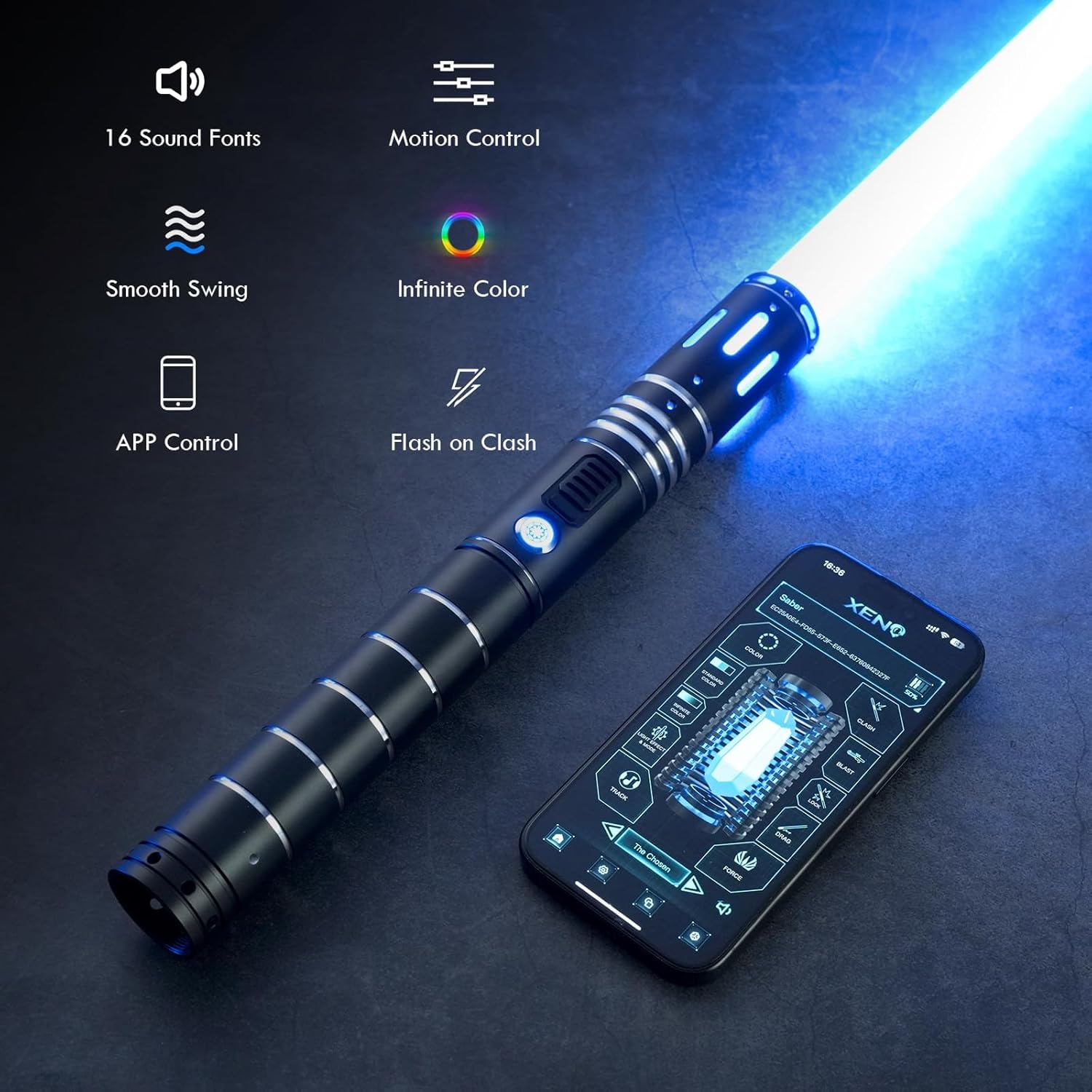 Enhanced Customization via APP: Tailor your light saber experience with the XENO-Configurator app. Effortlessly adjust light effects, switch blade modes, check the battery status, fine-tune sensitivity, and toggle motion control on or off
