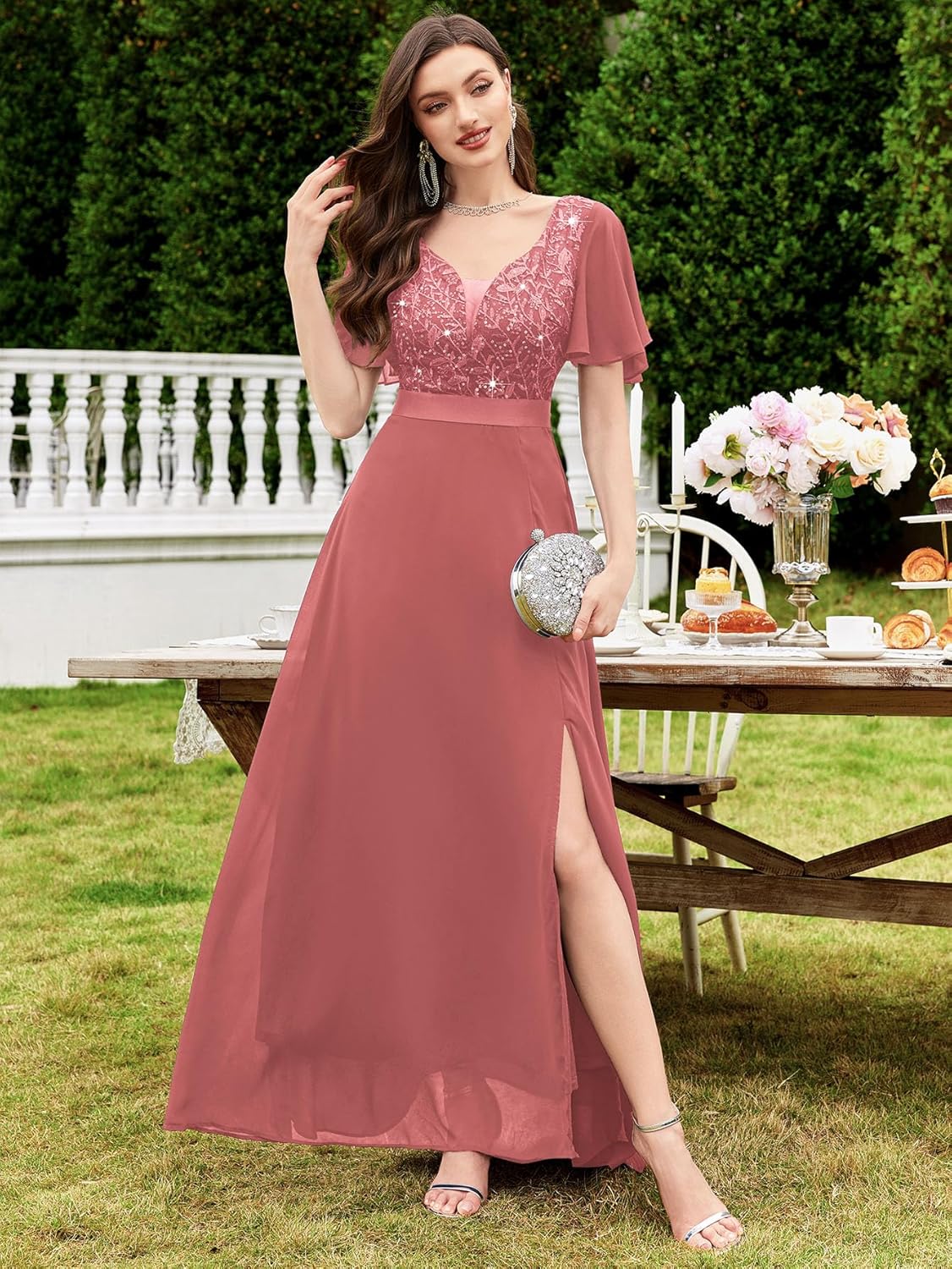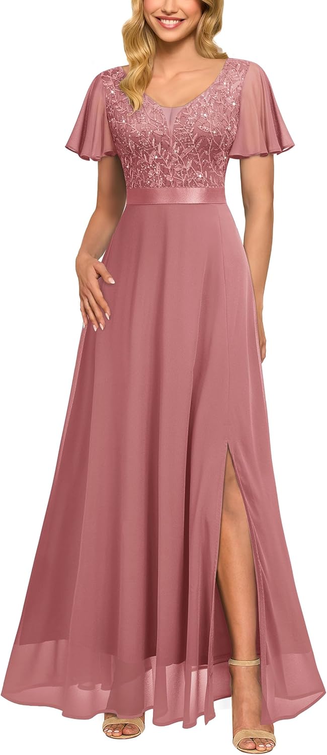 Miusol Women's V-Neck Sequin Lace Classy Ruffle Sleeve Bridesmaid Maxi Dress