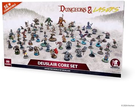 Dungeons & Lasers Deuslair Core DND Miniatures Set - 99 Models with Scenic Bases - 5E Compatible for use with D&D and Tabletop RPG Games - Unpainted and Unassembled - for Ages 14 Years +