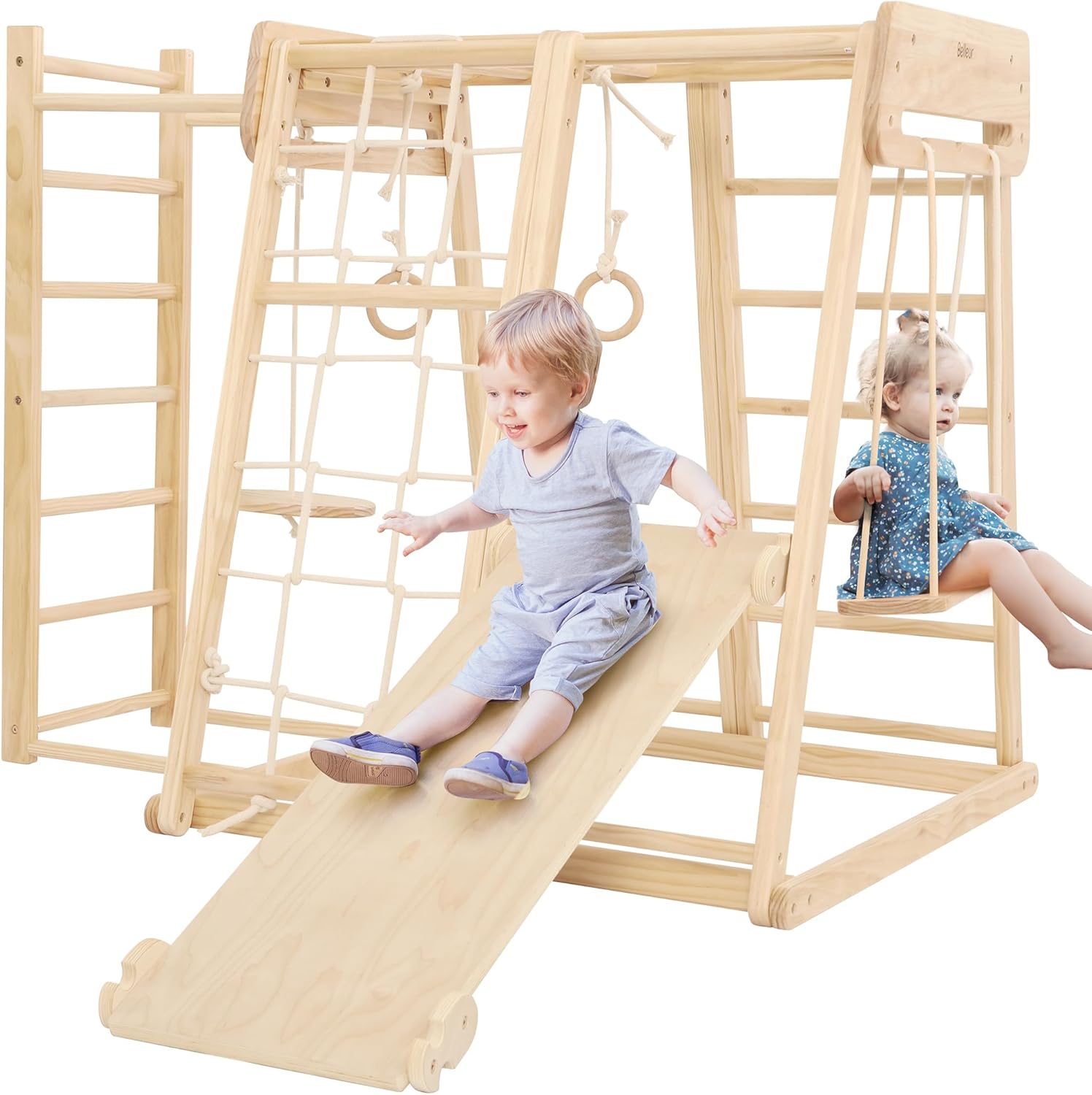 8-IN-1 PLAY FEATURES: Our 8-in-1 indoor jungle gym gives kids an exciting place to move, play, and stay active indoors. This toddler playset includes a double-sided board(slide, climbing rock), climbing net, rope ladder, monkey bars, square/round swing, hanging ring, Your kid will enjoy endless fun in one set!