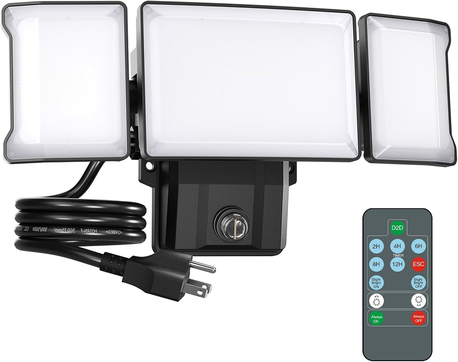 Olafus 60W Plug in Flood Lights Dusk to Dawn Outdoor Lighting, 6000LM LED Security Light with Remote, IP65 Waterproof, 6500K Daylight Exterior Floodlight for Yard Garage Garden Black