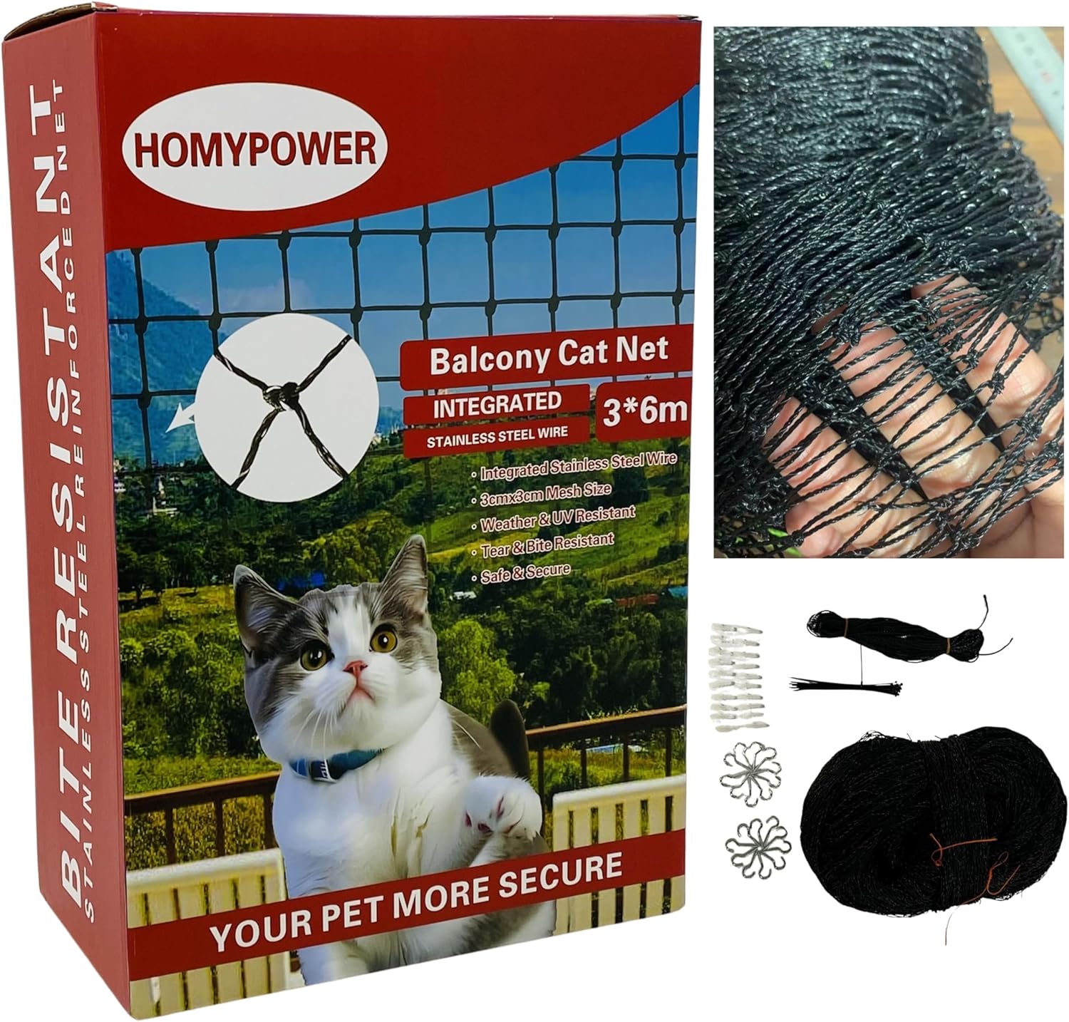 [STURDY and DURABLE MATERIAL] Our Black color Balcony netting for pets made of HDPE ( High-Density Polyethylene) and reinforced stainless steel wire. HDPE and Reinforced Stainless Steel Wire Cat net is stronger and more long-lasting than normal nylon and other, not easy to tear, and more resistant to cat bites. It is UV and weather resistant. Our Cat Netting Balcony have measuring 10x13 ft , 10x20 ft and 10x26 ft. You can also flexibly cut to the desired size. 3x3 cm holes ensures it won't obstruct your balcony view. The mesh and holes design allows for normal ventilation, not affecting the line of sight.