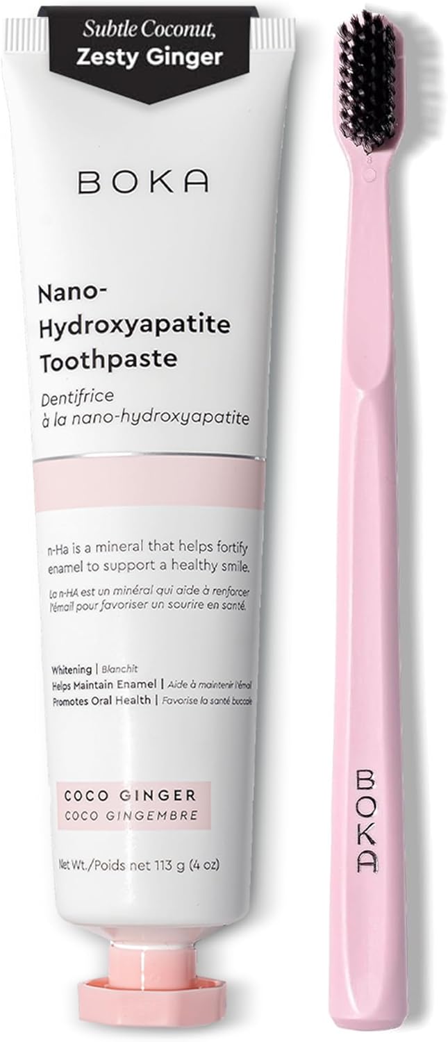 Boka Fluoride Free Toothpaste - Nano Hydroxyapatite - Coco Ginger 4oz and Classic Manual Toothbrush with Extra Soft Activated-Charcoal, Pink