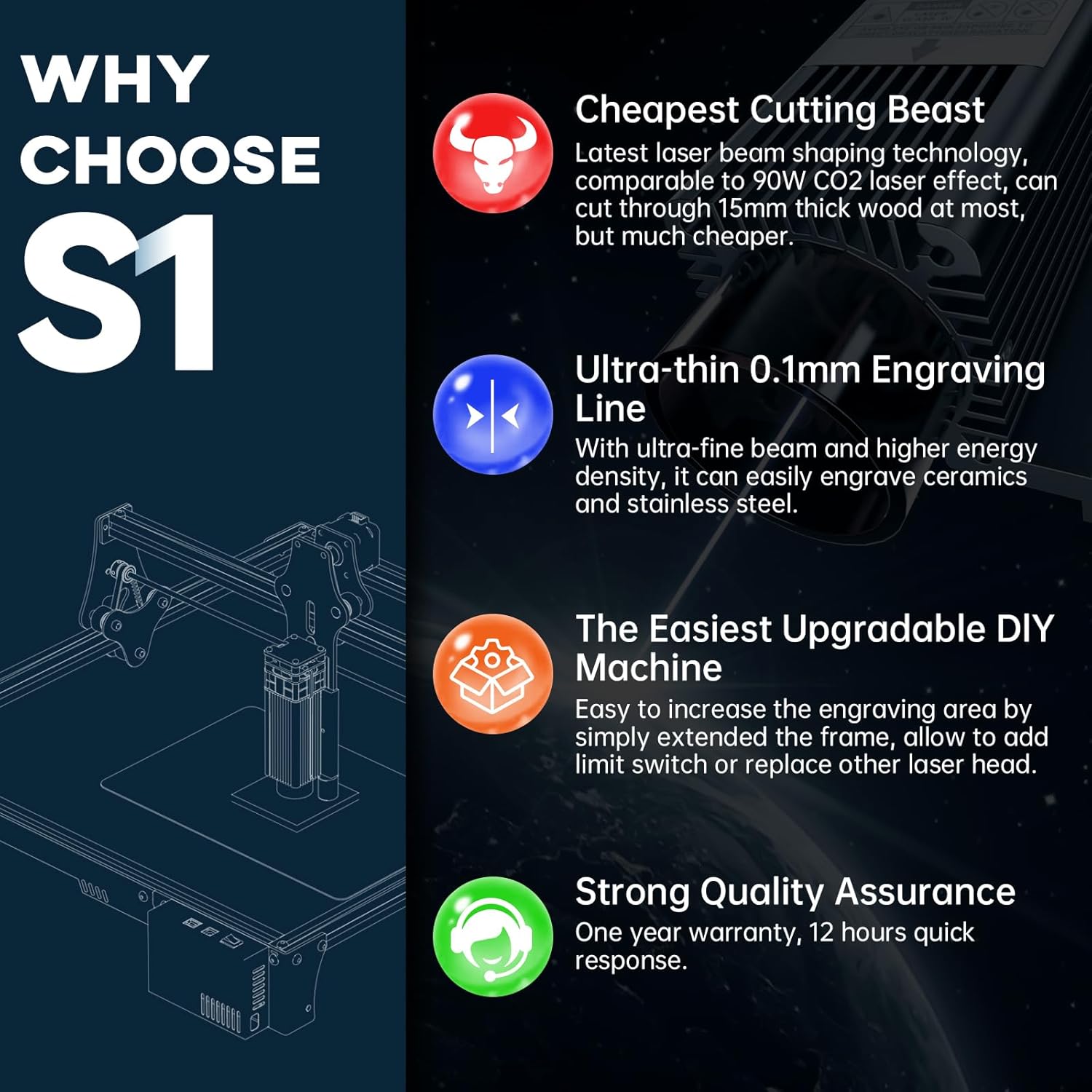 【Upgraded Design】SCULPFUN S1 Laser Engraver can extend the frame, increase the engraving area, and can replace other laser heads. The 90w laser engraving machine is equipped with a power switch, which can be turned off safely and quickly in an emergency. Mounting holes are reserved for the four-leg and body structure to facilitate the connection between the machine and the data cable. The A4 size protective plate can protect the table from laser damage and isolate the hidden fire hazard.