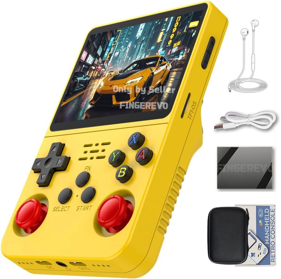 R36S Parameters:Screen: 3.5-inch IPS display full view angleResolution: 640*480 4:3Battery: 3200mAh, 3-5hours battery lifePort: 2*USB-C(1*OTG+1*DC), 1*3.5mm earphone jack, dual tf-card slotSystem: ArkOS opensource systemCPU: RK3326 quad-core 1.5GHz Cortex-A35GPU: Mali-G31MP2(520MHz)Expansion: Support maximum 512GB card(Not Including)Speaker: 8WConsole Size: 4.7*3.3*0.8inch (120*85*21mm) Package Including1*R36S Yellow1*Portable Case by FINGEREVO1*Screen Protector1*Earphone by FINGEREVO1*USB-C Charge Cable1*Instruction