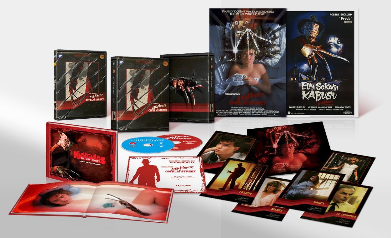 All Regions. Hailed as "one of the most intelligent and terrifying horror films of the 1980s" (The Movie Guide), celebrate 40 years of Wes Craven's nightmarish masterpiece with a brand new 4K restoration and Ultimate Collector's Edition featuring a Steelbook with new key art, theatrical poster and other premiums. From modern horror master Wes Craven (Scream 1, 2, and 3) comes a timeless shocker that remains the standard bearer for terror! Nancy is having grisly nightmares. Meanwhile, her high-school friends, who are having the very same dreams, are being slaughtered in their sleep by the hideous fiend of their shared nightmares. When the police ignore her explanation, she herself must confront the killer in his shadowy realm. Includes: Steelbook Rigid Slipcase Double-Sided Poster Art Cards Booklet Numbered Element Special Features: Ready Freddy Focus Points - See Alternate Takes and Learn Filmmaking Secrets Behind the Nightmare by Jumping to Video Highlights While Watching the Movie Commentary 1 - Director Wes Craven, Costars Heather Langenkamp and John Saxon, and Cinematographer Jacques Haitkin Commentary 2 - Wes Craven, Costars Robert Englund, Heather Langenkamp and Ronee Blakley, Producer Robert Shaye, and Co-Producer Sara Risher Alternate Endings The House That Freddy Built: The Legacy of New Line Horror featurette Never Sleep Again: The Making of A Nightmare on Elm Street featurette Night Terrors: The Origins of Wes Craven’s Nightmares featurette