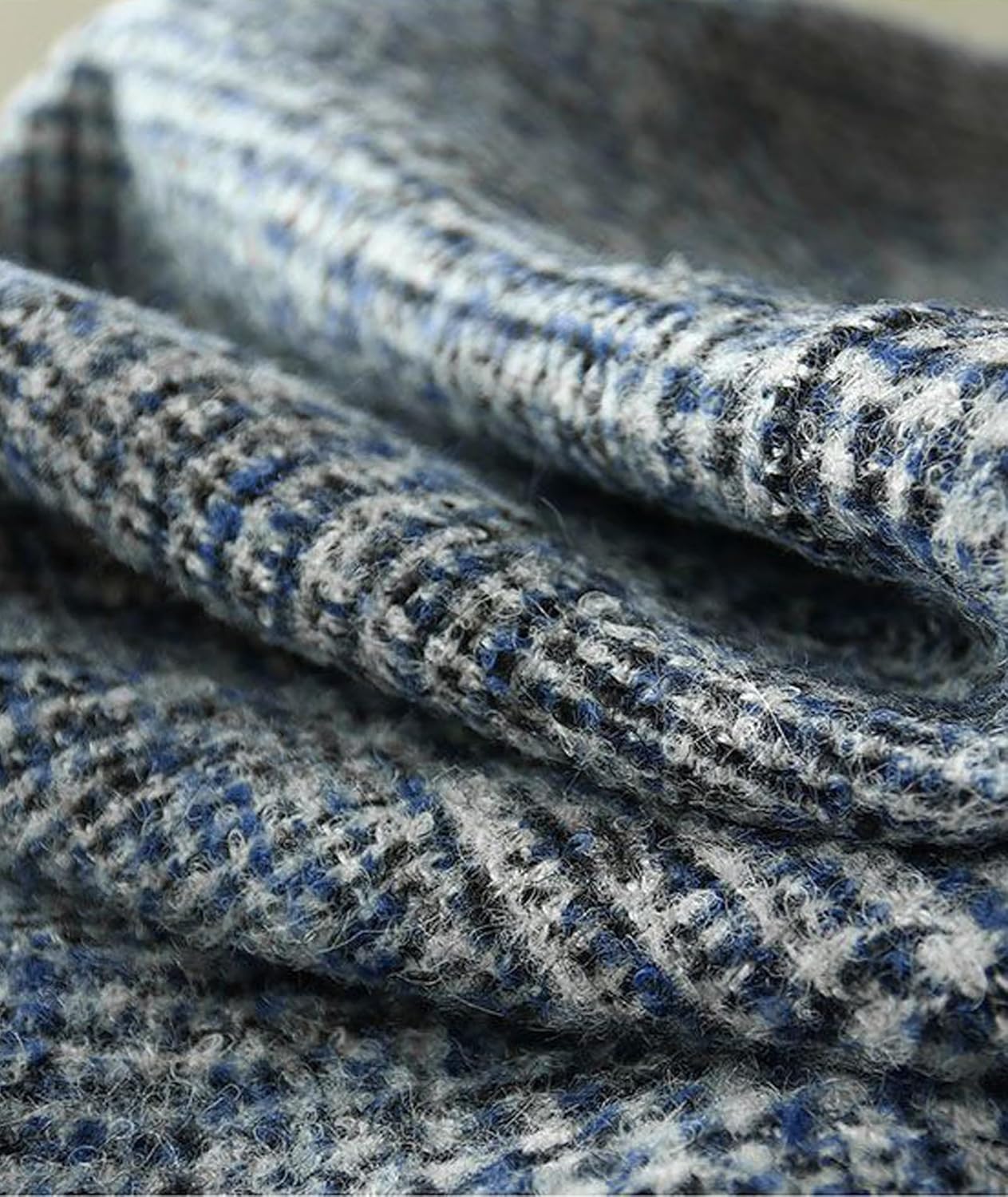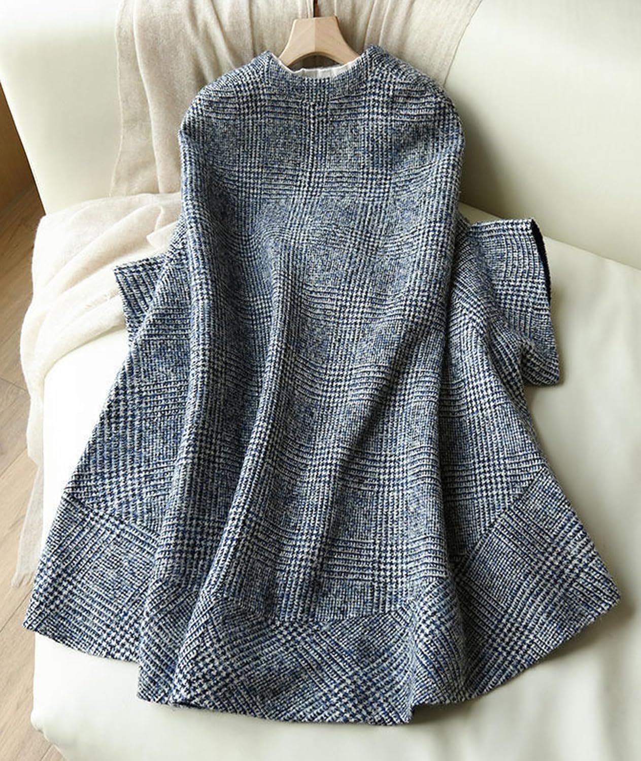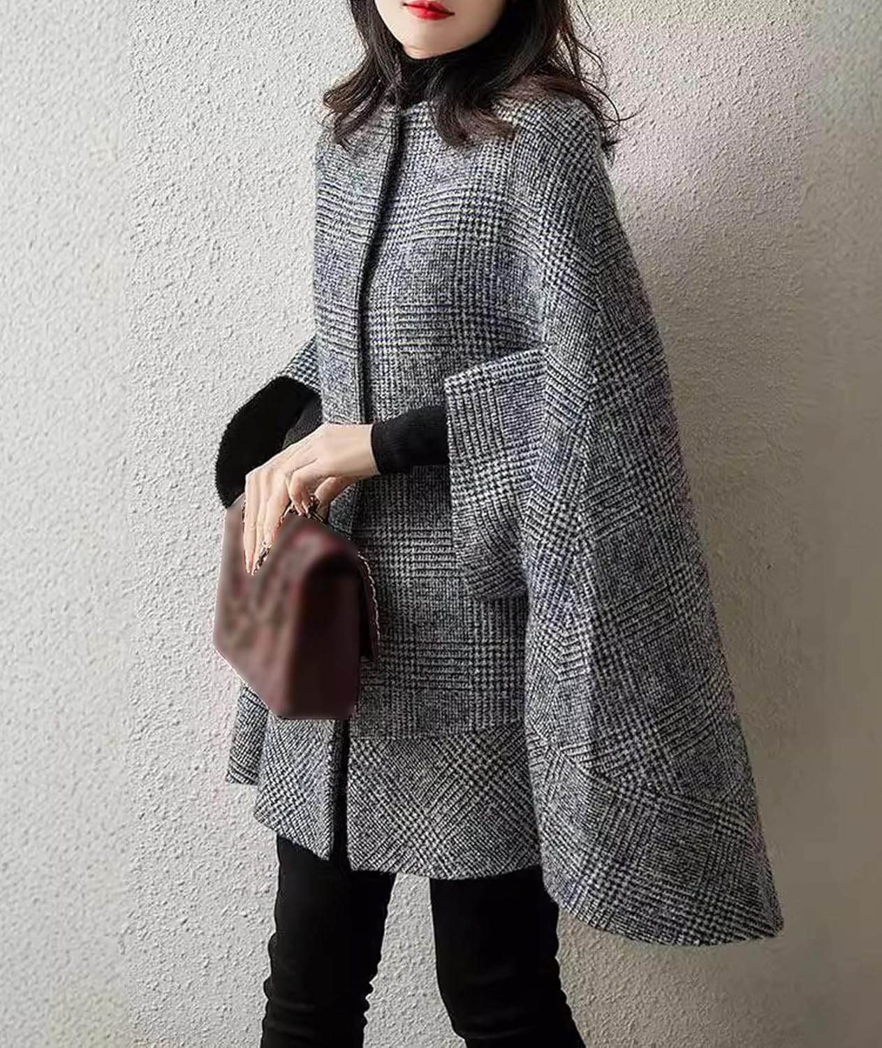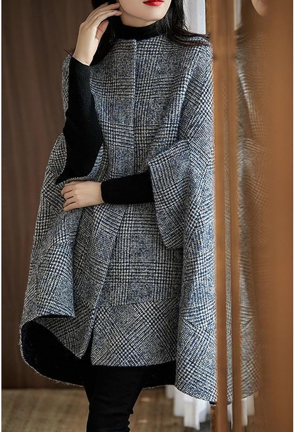Women's Winter Crewneck 3/4 Sleeve Capel Wool Coat Single Breasted Plaid Cloak Coat Poncho