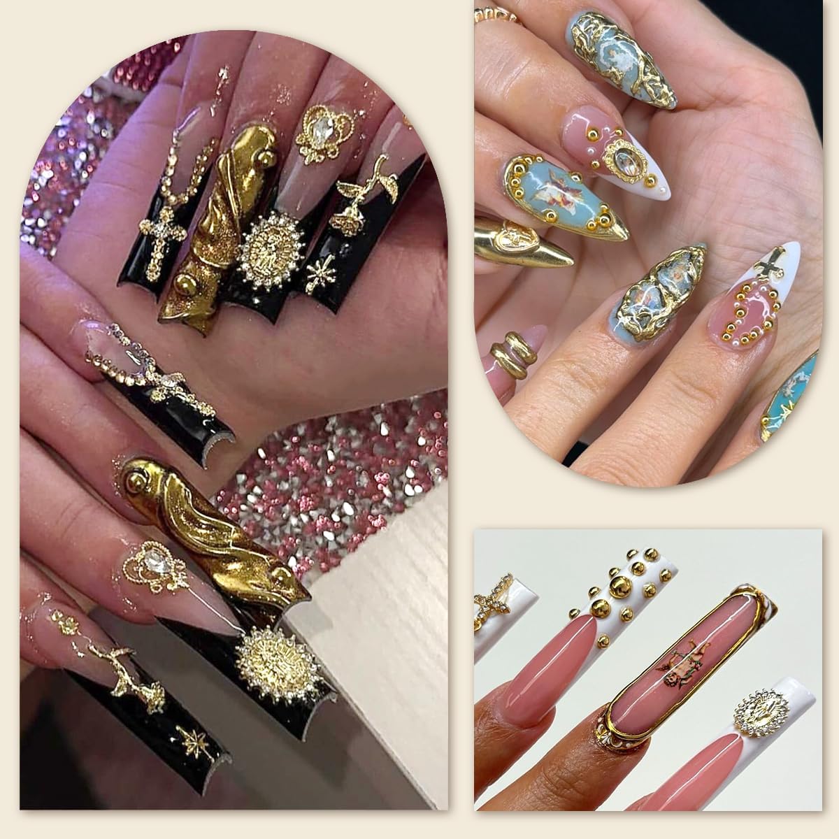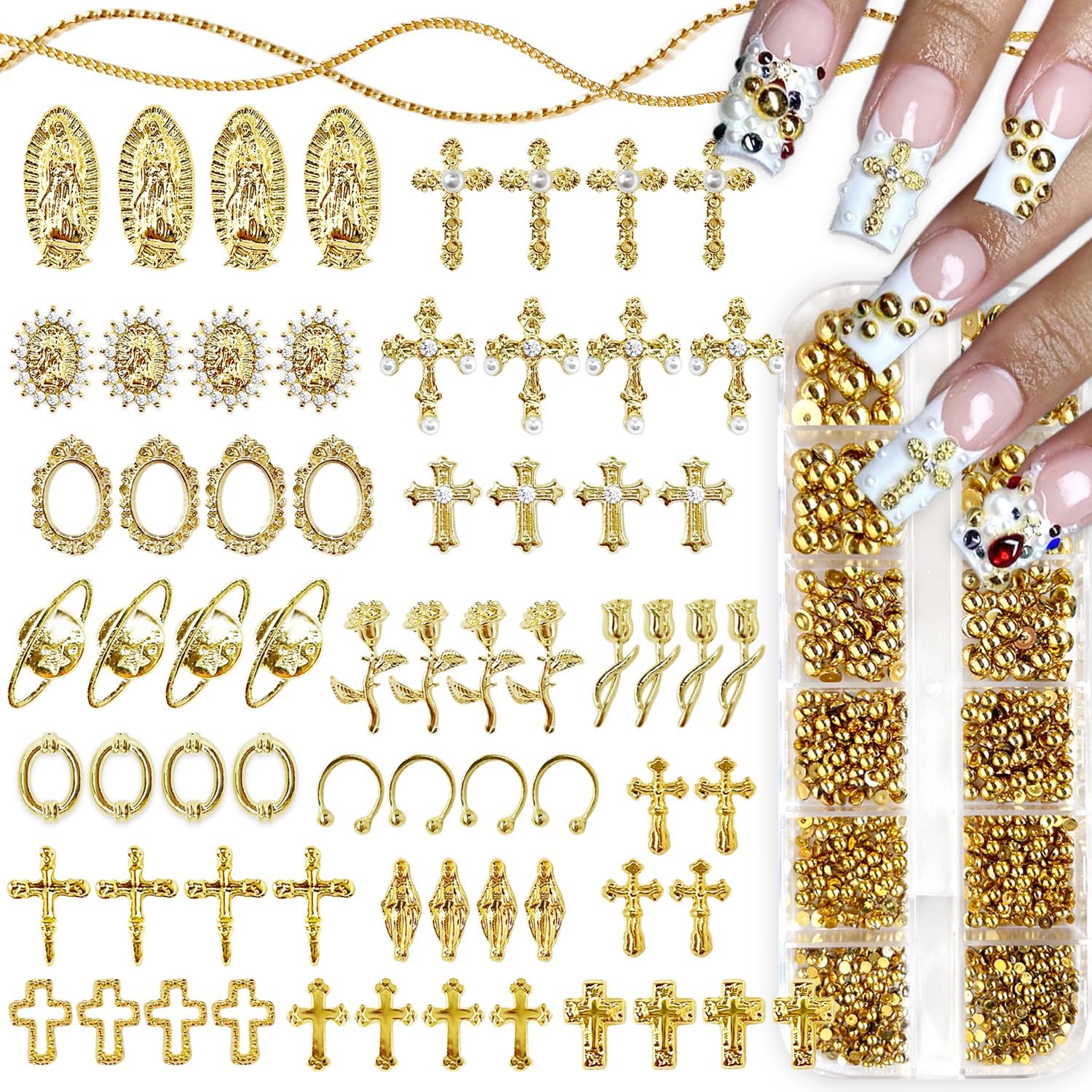 Nail Charms Y2k: If you are a nail art lover, you must not miss this gold nail charm and flat back pearls set. Include 3d gold cross, Virgin Mary, gold ball and nail chains design. Multi shapes and bulk quantity, which can meet all your needs for DIY nail art design, make your nail more charming!