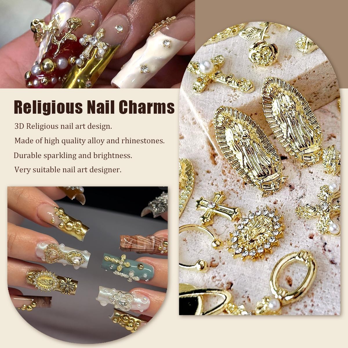 Gold Charms for Nails: These gold religious nail charms show the Y2K style, 3D Cross and Virgin Mary bring you peace and blessing, as well as being a good reminder of your faith. It is also perfect match with other nail art charms design, let your nails looks very delicate and beautiful.