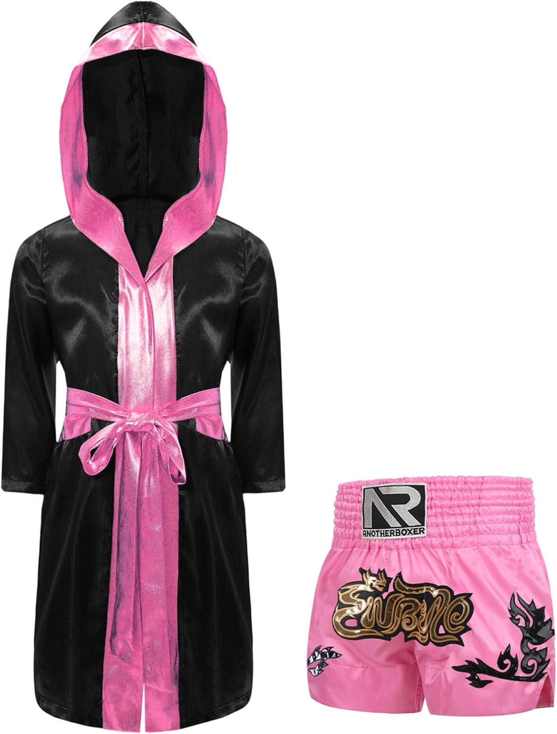 TiaoBug Child Boxing Costume Outfits Open Front Metallic Trim Satin Belted Robe Hooded Cloak with Shorts Set