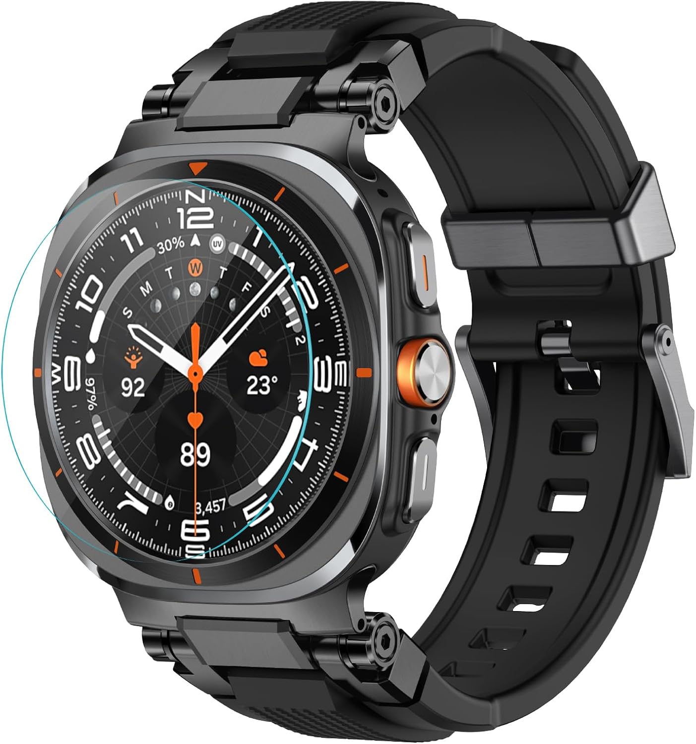 amBand for Samsung Galaxy Watch Ultra (2024) Bands for Men, Metal Connector Rugged Strap for Galaxy Watch 7 Ultra 47mm, Sport Accessories with 9H Tempered Glass Screen Protector - Black/Black