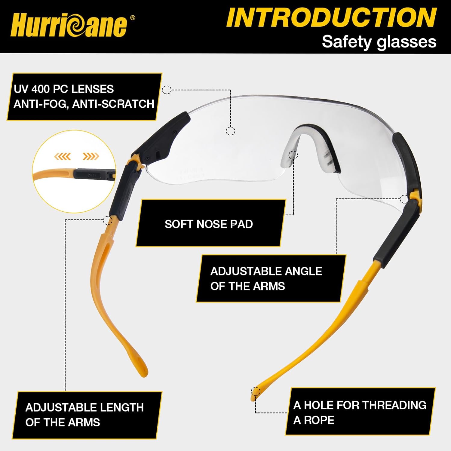 HURRICANE UV400 Safety Glasses, Clear Lens, Lightweight Protective Goggles with Anti-Fog & Anti-Scratch Coating, Adjustable Nylon Frame & Flexible Temples for Work, Lab, Construction, Workshop & More