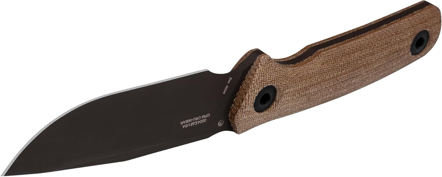 The 0004 workhorse slices and chops through the toughest outdoor and bushcraft challenges. Its clip point blade uses premium Cru-Wear, a tough and easy-to-sharpen steel in the field. Easily control the canvas micarta handle, which is 3D-machined and contoured for your hand. Use an Allen wrench to strip the knife down for easy cleaning and reveal the skeletonized steel tang, ready for paracord wrapping. Carry the 0004 in multiple configurations using a Kansas-made, saddle tan leather sheath, storing the ultimate tool for your journey.