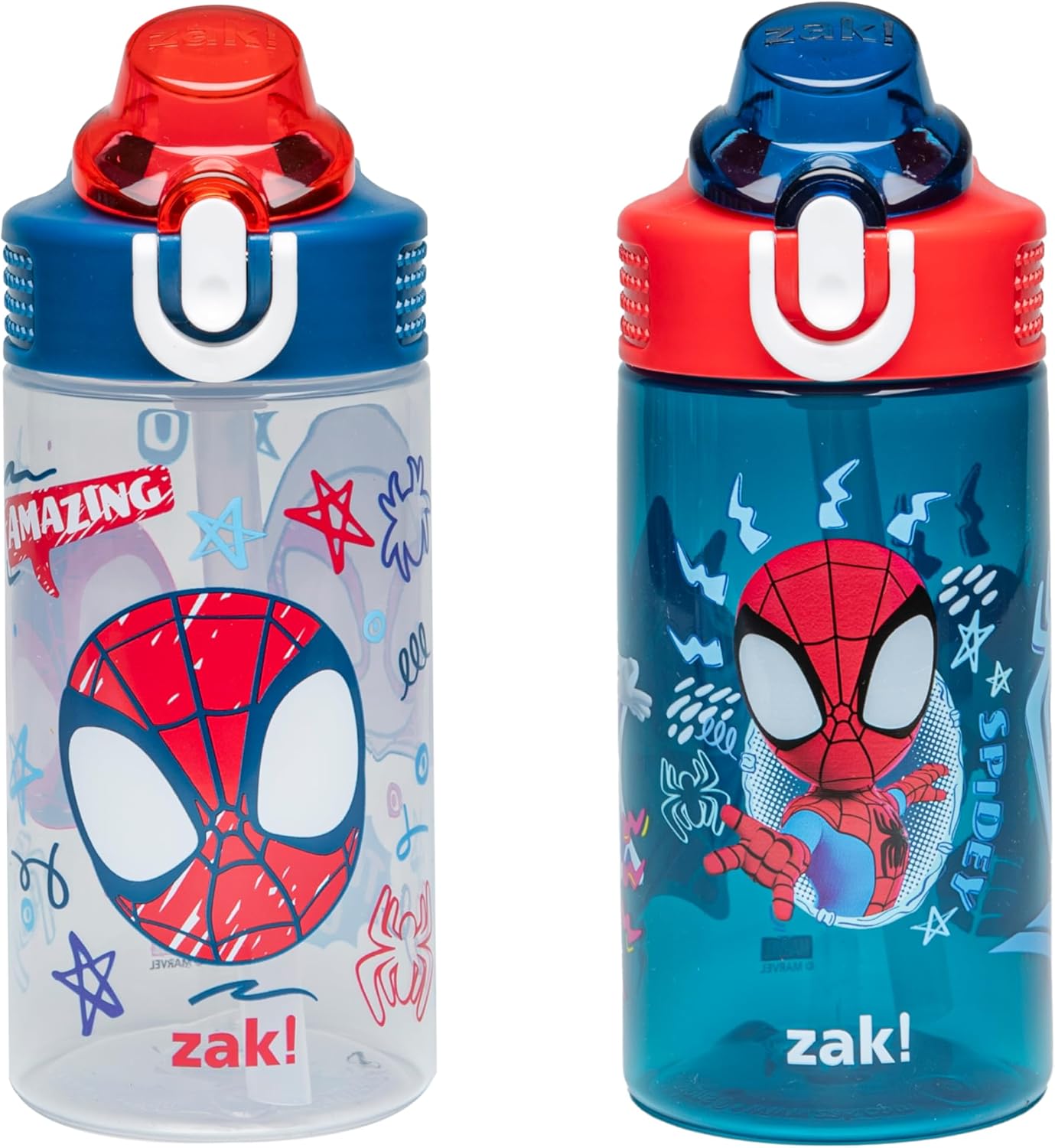 Let kids enjoy hydration with a fun Spider-Man water bottle set by zak! designs! Easy to Clean: The silicone spout and straw can be removed from the lid, and the pieces are dishwasher safe for simple cleanup at the end of the day. Reusable and Durable Material: Reusable water bottles will last wash after wash—good news for you and the environment! The 16 oz water bottles are made of PP plastic, durable enough for kids to use every day and bring on any adventure. Leak-Proof Lid: The lid screws on securely and won't leak when the spout is closed, though water flows for easy drinking when the spout is open. The easy-open button has a flip-up lock to keep it from activating accidentally. On the Go: The water bottle has a built-in carrying loop on the lid for easy transportation, and with the spout cover to keep the spout clean and closed, it can be tossed into a bag for worry-free travel. Specifications: Set of two water bottles with 16 oz capacity. Made of durable plastic. BPA-Free - zak! is committed to safety. Dishwasher safe, do not microwave. Length: 4.33-inch, Width: 2.78-inch, Height: 7-inch. Character: Spidey, Spin, Ghost-Spider (Marvel's Spidey and His Amazing Friends).