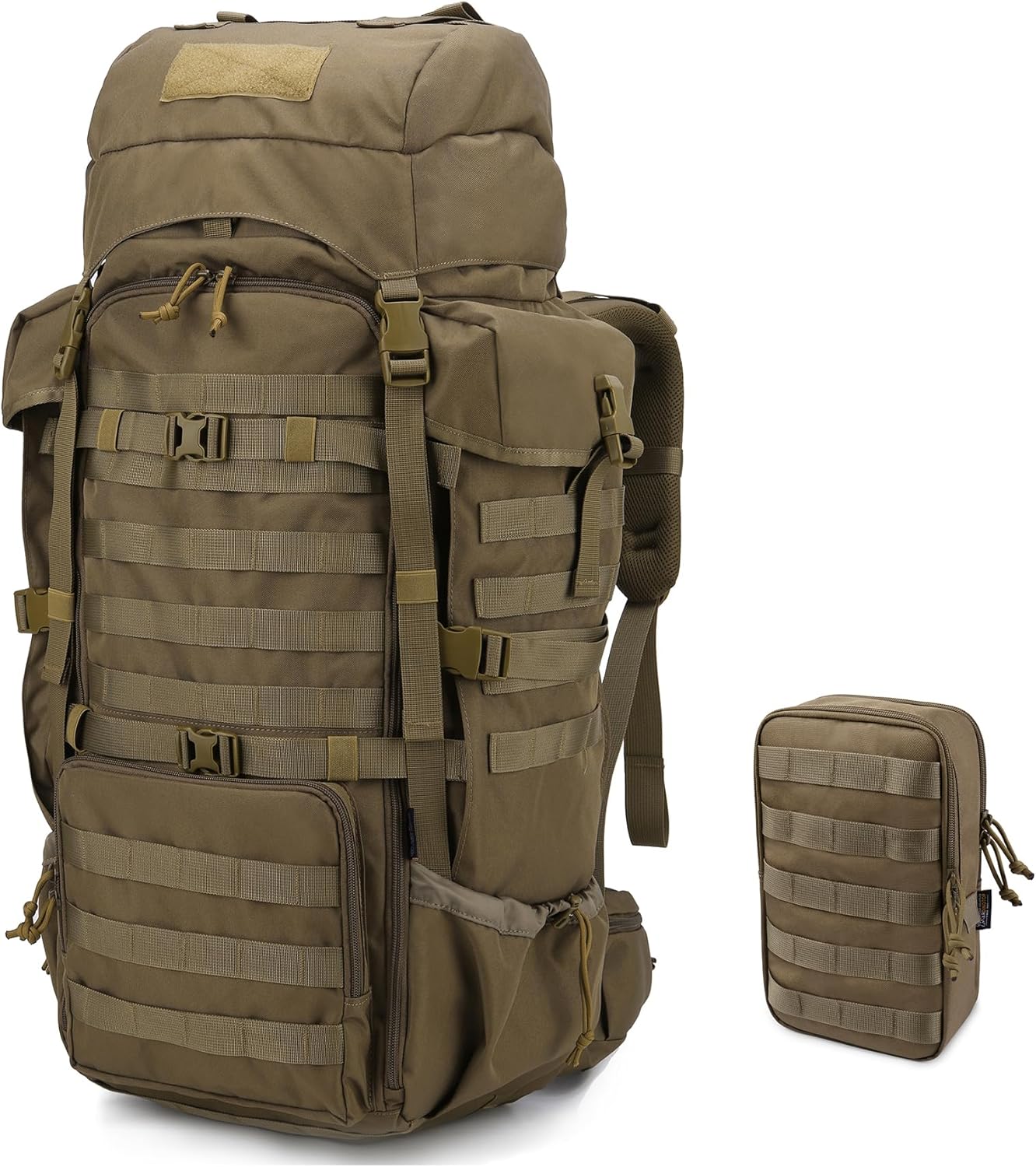 Composition:This backpack set includes a 70L Internal Frame Backpacks with rain cover and a Tactical Pouch,YKK buckle and zipper ,Molle Pouch Size: 6.5*3.1*10.6 in