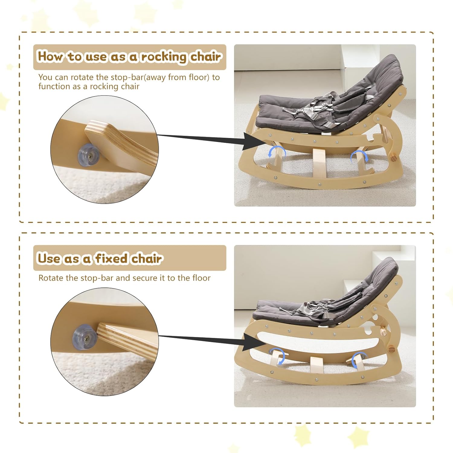 3-in-1 Baby Bouncer Adjustable Wooden Rocker Chair, Ergonomic Design Baby Lounger with Removable Cushion,Seat Belt and Booster, Recliner for Infants to Toddler (Grey)