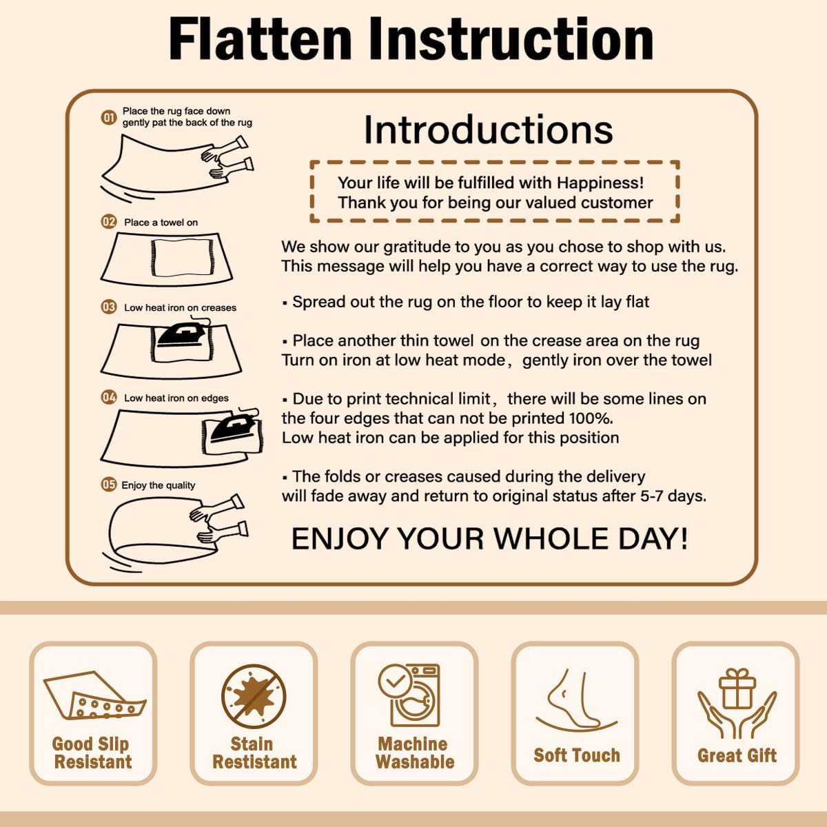 Tips: The carpet will arrive with temporary creases, you can repeat the process several times by rolling the carpet in the opposite direction of the creases and then spreading the carpet flat and pressing the edges of the roll with a heavy object to restore the carpet to its original state. We recommend using an iron to iron carpets at low temperatures more quickly Size: 2 sizes can be chosen of our rugs dimension: 3' x 5' x 0.39'' 100cm x 150cm x 1cm. 5' x 6'6'' x 0.39'' 150cm x 200cm x 1cm. Material: Made with 100% polypropylene. No chemicals used, No dye substance harming the health of you or your family. The rubber non slip design on the bottom of the area rug for bedroom is the safest protection. One piece is enough,you don't need to buy additional non slip carpet pads Machine washable: Soak in cold water for 10 minutes,then folded twice and put into the washing machine on gentle cycle, and then dry in the air.Do not use chlorine or bleach Features: With many different patterns to choose from, you will easily find rugs to coordinate with your decor. Our rug is widely used as the floor rug as well as a play mat, kitchen rug, bedroom rug, laundry mat, living room mat, office rug etc. Notes: Due to the light and screen setting difference, the item's color may be slightly different from the pictures Please allow slight dimension difference due to different manual measurement