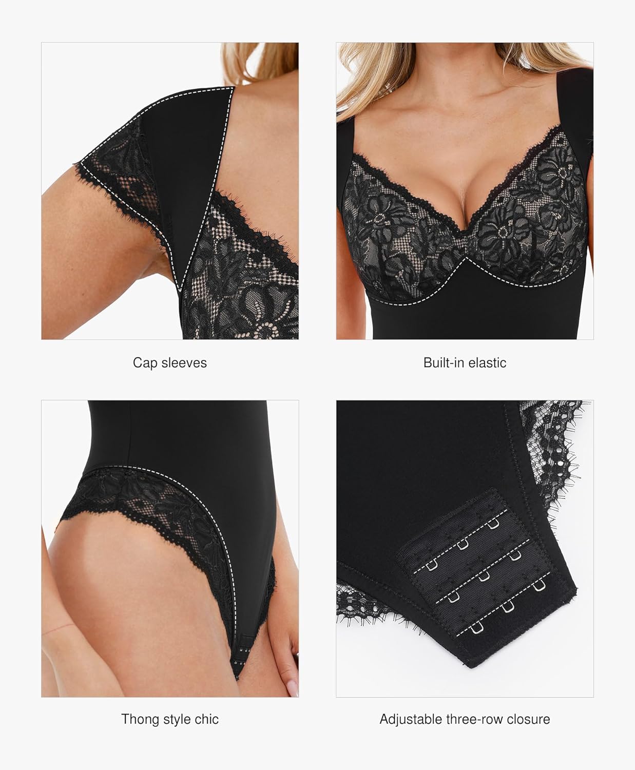 Popilush Lace Tops Body Suits for Womens Tummy Control Shapewear Bodysuit V Neck Party Date Night Outfit Body Shaper