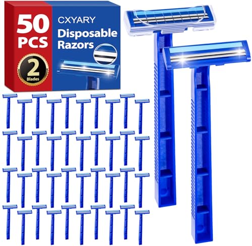 CXYARY 50 Pcs Disposable Razors With Lubricating Strip, 2 Blade Razors with Clear Safety Cap, Disposable Razors Bulk for Men Women, Multipurpose Portable Shave Razor for Bathing Hotel Travel, Blue