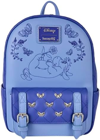 A cute, subtle style that still shows off your love for Eeyore! Eeyore's embroidered on the front, playing with a flower, surrounded by plants and butterflies. The front pocket has a quilted top flap styled with molded metal charms of butterflies for an extra cute detail. For anyone whose favorite character is Eeyore, this bag is a must-have.