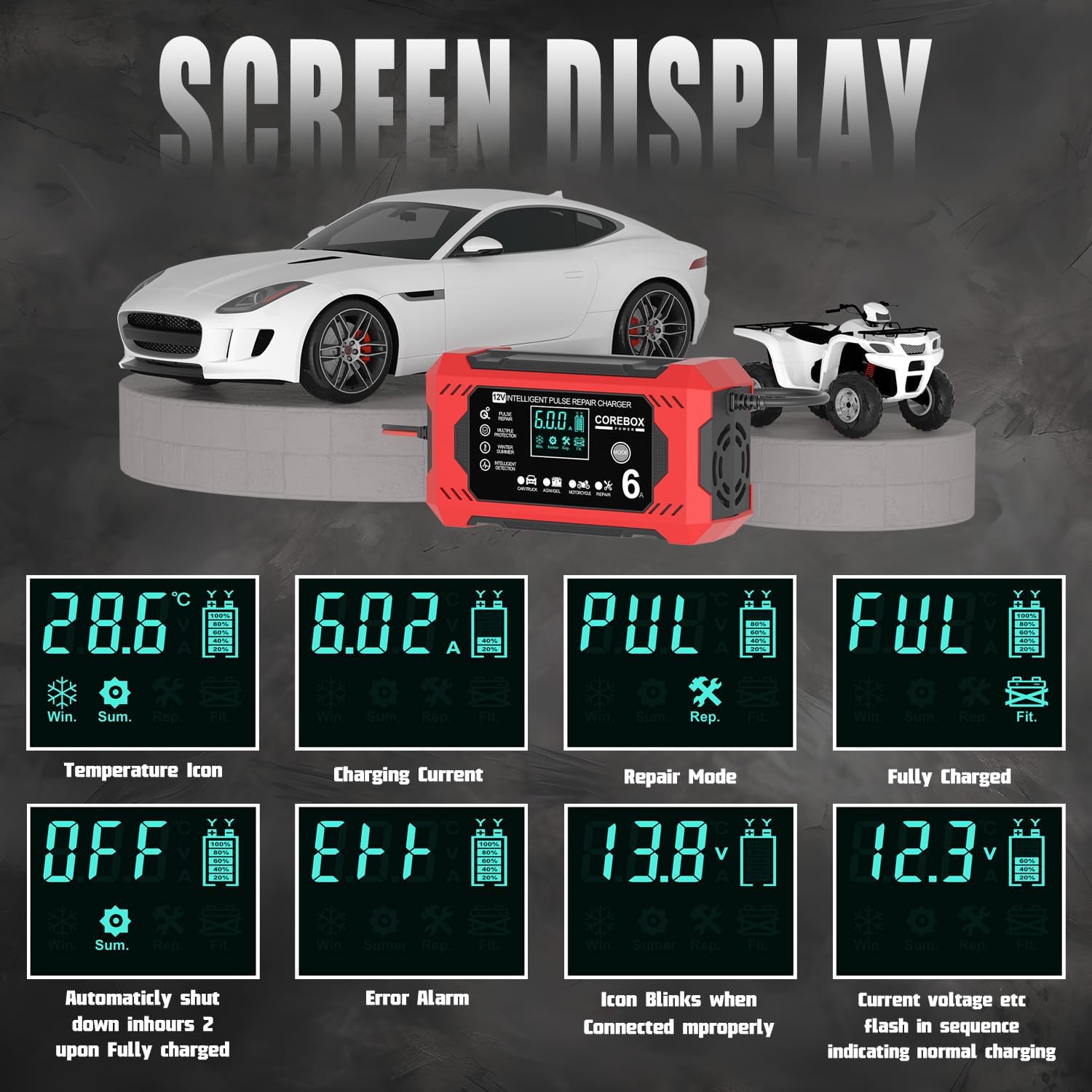 【HIGH-EFFICIENCY PULSE REPAIR】More advanced pulse repair function, Corebox car battery charger uses slow pulse repair technology, will automatically detect battery sulfation and acid stratification, achieve stronger engine start and longer battery life to restore lost battery performance, help repair old/idle batteries and extend battery life. If your battery will not charge, you can try the "Repair" mode to repair your battery. PLEASE NOTE: IT CAN NOT REPAIR A totally DEAD BATTERY