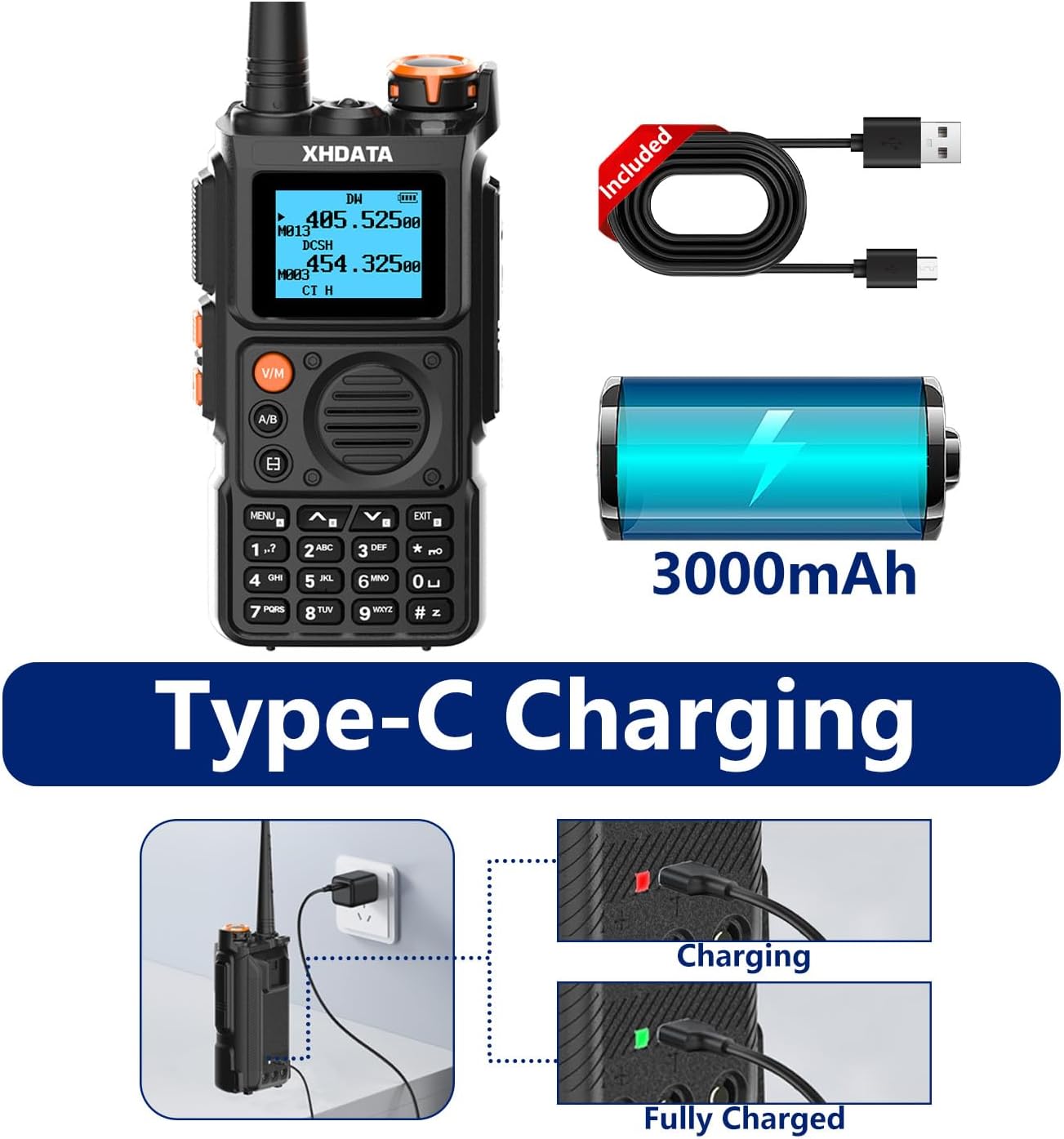 【Batería Recargable de 3000mAh】- Los walkie talkies XHDATA E100 de largo alcance están equipados con una batería recargable de alta capacidad extraíble, los walkie talkies E100 soportan carga por puerto Type-C (cable de carga incluido) y ofrecen opciones convenientes de carga de escritorio (cargador de escritorio no incluido), asegurando que mantengas suficiente energía durante el uso prolongado.