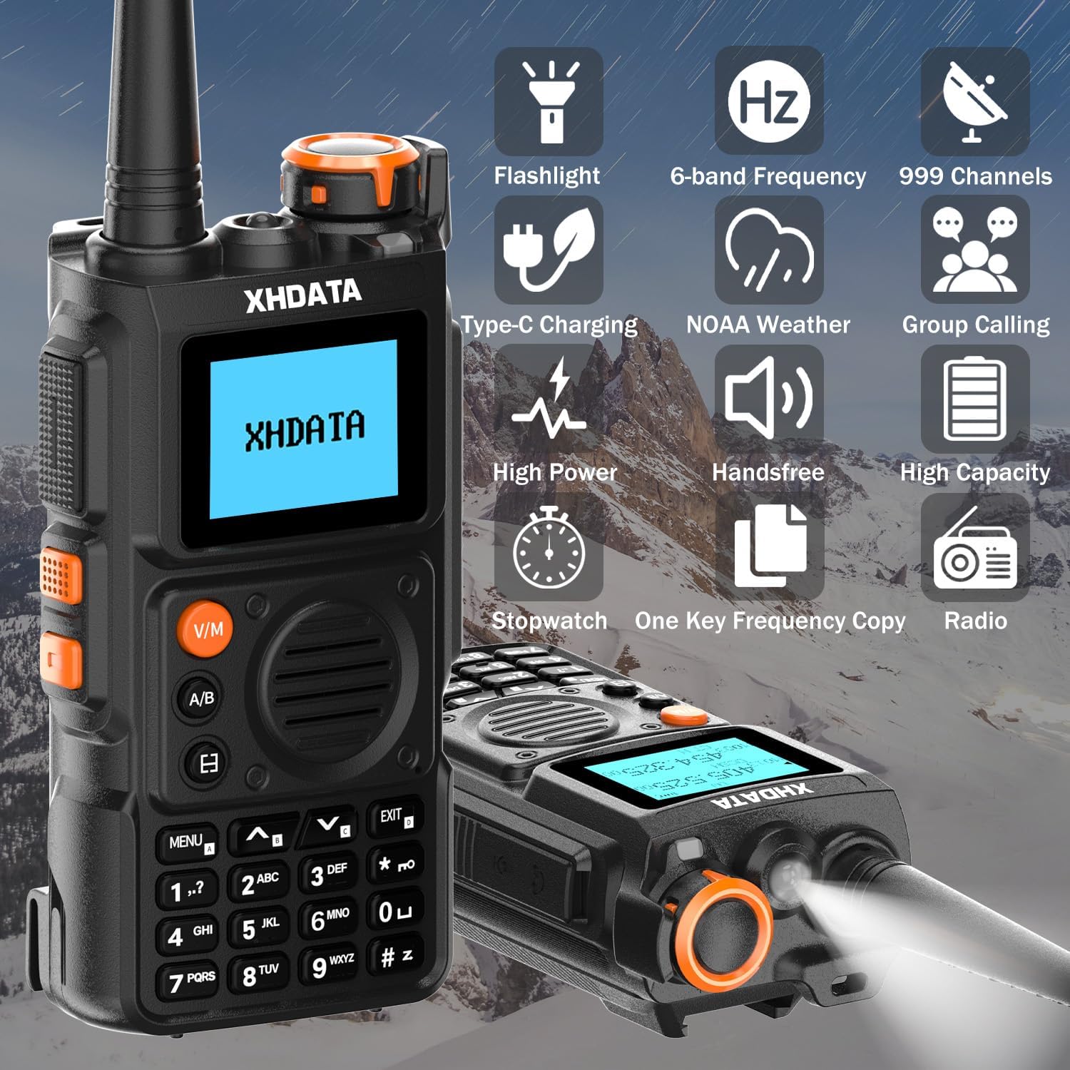 【Capacidad de Transmisión Triple Banda Potente】 - El walkie talkie XHDATA E100 con potencia de salida de 6W, compatible con múltiples bandas de frecuencia incluyendo VHF, UHF, FM, bandas de aviación y NOAA. El radio bidireccional E100 asegura que disfrutes de una comunicación clara y confiable tanto en los suburbios como en la ciudad.