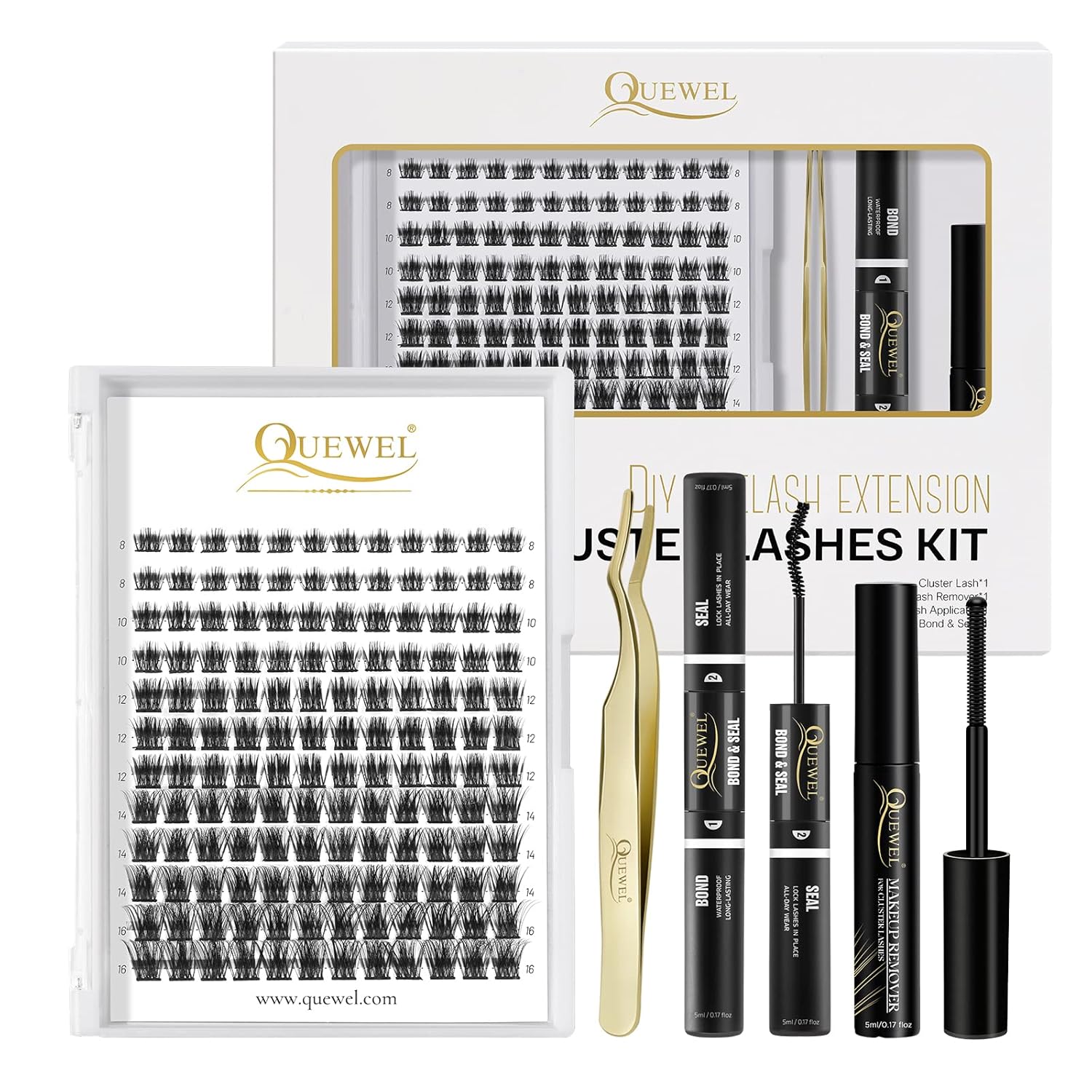 A Perfect Set-DIY Lash Extensions Kit: QUEWEL DIY eyelash extensions kits, 144pcs wide stem lash clusters, black lash bond&seal, a golden tweezer for applying lash clusters and 5ml cluster eyelashes glue remover, you can get all the products you need for DIY eyelash extensions at an affordable price, so convenient to use at home or travel, without taking up too much storage space