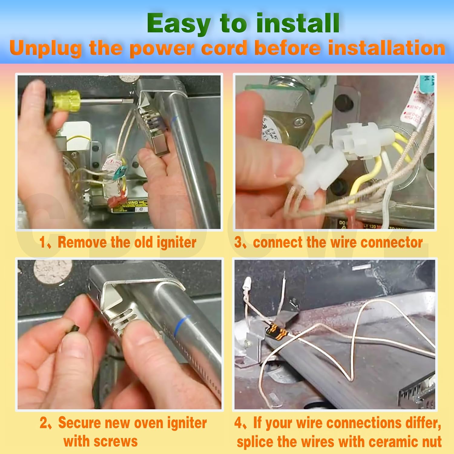 【INSTALLATION INSTRUCTIONS】: Simply remove the old igniter and reconnect the new one( If wire connector does not match up you will need to cut off the connector and splice the wires with porcelain wire nuts). Unplug the cooktop before installing the oven igniter.