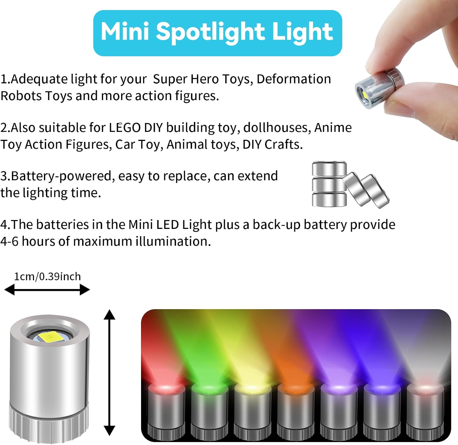 WIDE APPLICATIONS:This mini LED light can provide Plenty of light for your Super Hero Toys, Deformation Robots Toys and more action figures, include LEGO DIY building toy, dollhouses, Anime Toy Action Figures, Car Toy, Animal toys, DIY Crafts and more, Providing plenty of dazzling lighting, the light makes them look even more dazzling and gorgeous.