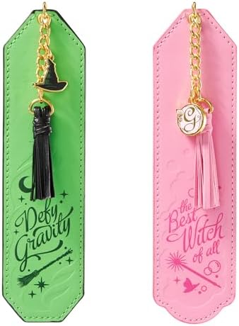 Take home a memento of your trip to Oz with this bookmark set from Wicked, featuring two faux-leather debossed bookmarks inspired by the characters of Glinda and Elphaba. Glinda’s pink bookmark features a “G” charm with pink tassel and is printed with the phrase “The Best Witch of All”. Elphaba’s green bookmark features a Hat charm with black tassel and is printed with the phrase “Defy Gravity”.