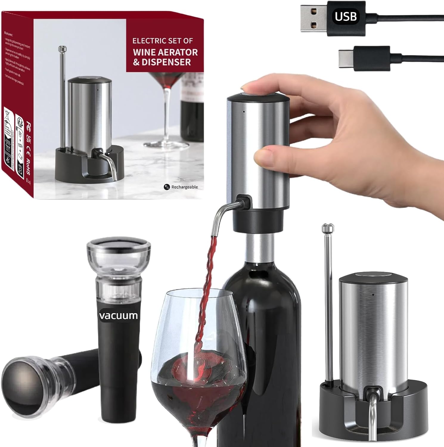 Rechargeable Electric Wine Aerator and Dispenser Set, Electric Wine Decanter with 2 Vacuum Wine Stoppers, Charging Base, Stainless Steel, Wine Pourer