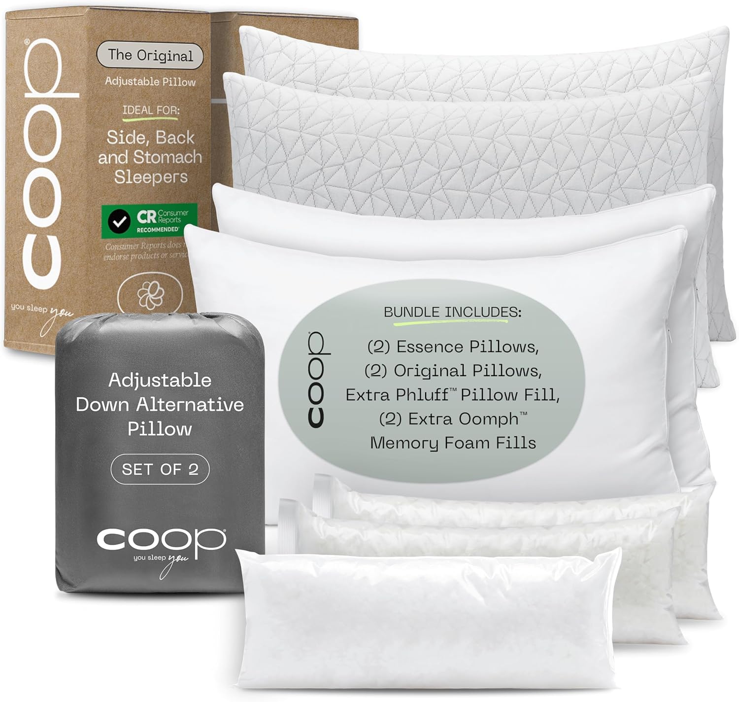 The Best of Both Worlds: The Essence Adjustable Down Alternative Pillow & Original Adjustable Pillow Bundle features our new Essence Down Alternative Pillow with our innovative Phluffballs and down alt fiber fill blend & our classic Coop Original Pillow, that you know & love, with a proprietary blend of memory foam and microfiber fill. Both the Essence & Original pillows are fully adjustable for adaptive support. Experience a best pillow & customizable sleep solution that suits your sleep style!