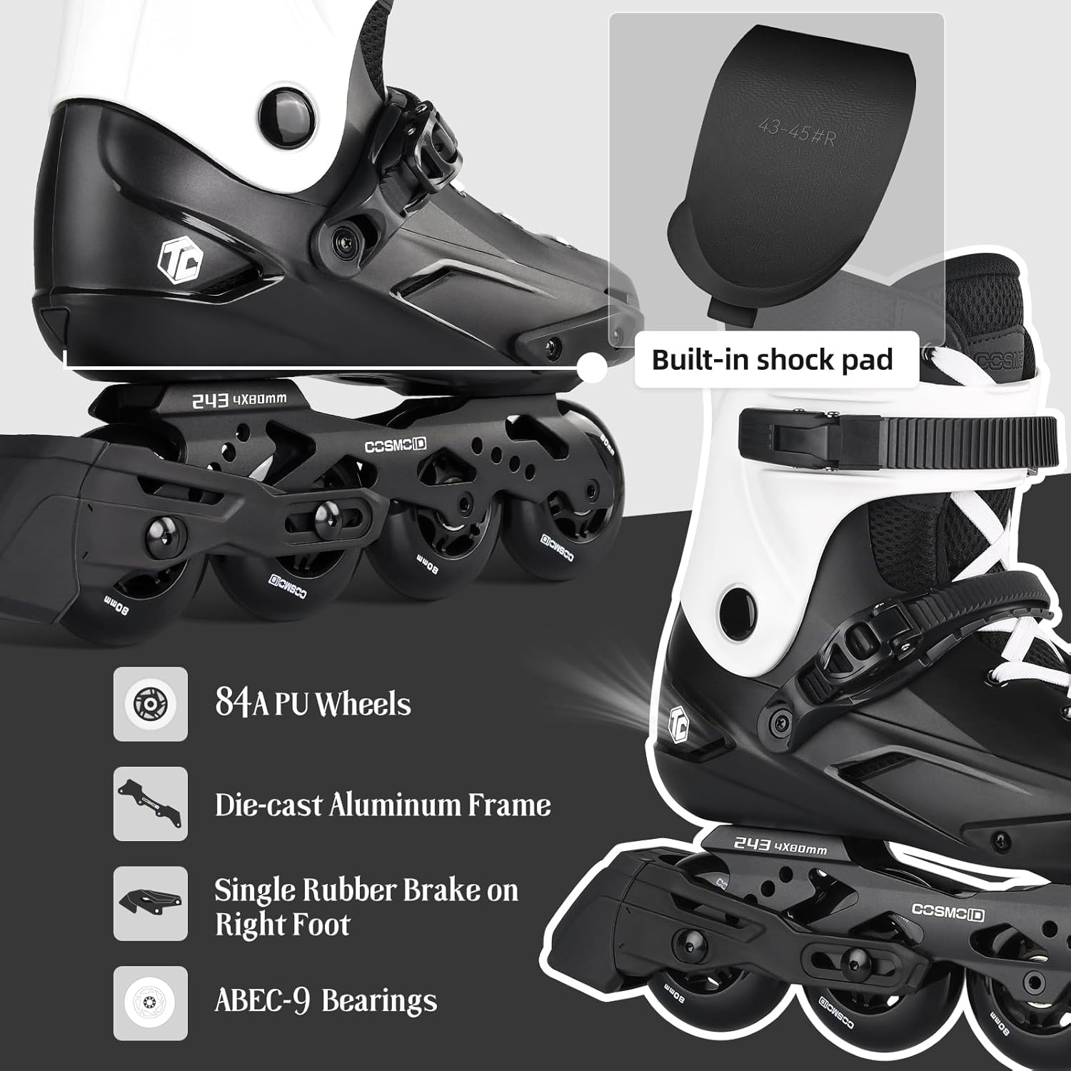 【HIGH-PRECISION PERFORMANCE】 Equipped with ABEC9 precision bearings, these inline skates offer unbeatable speed and smoothness. The 84A wheels are designed for a stable ride on various surfaces, ensuring you can skate with confidence and ease.