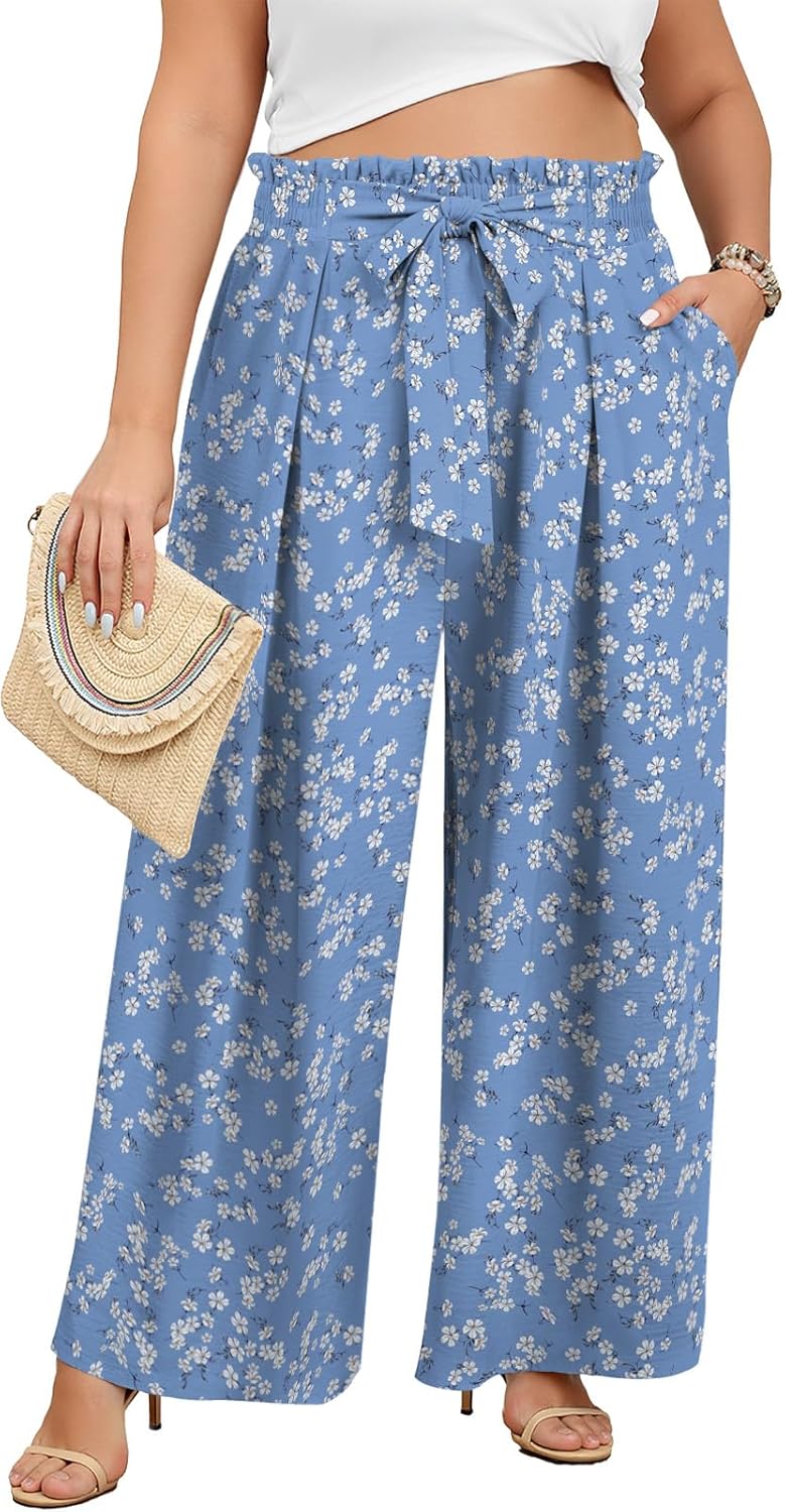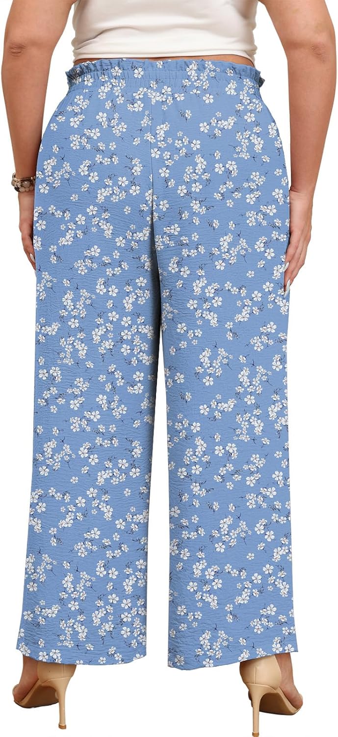 Lastshe Women's Plus Size Pants Wide Leg Work Casual Palazzo Pants Elastic High Waisted Dressy Trousers with Pockets