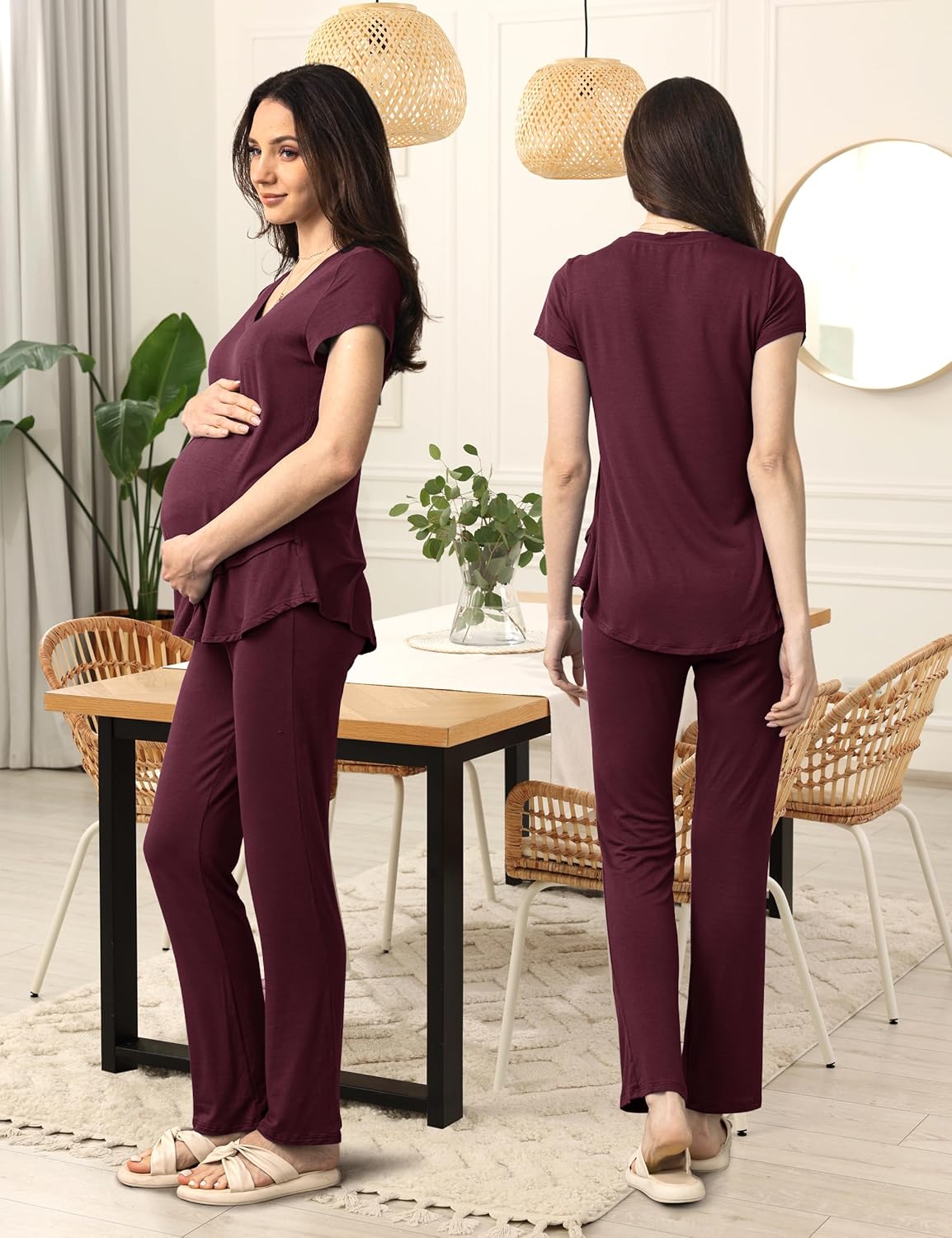SUNNYBUY 3 PCS Maternity Breastfeeding Pajamas Set, Hidden Nursing Tops, Adjustable Pregnancy Shorts & Pants Postpartum PJS
