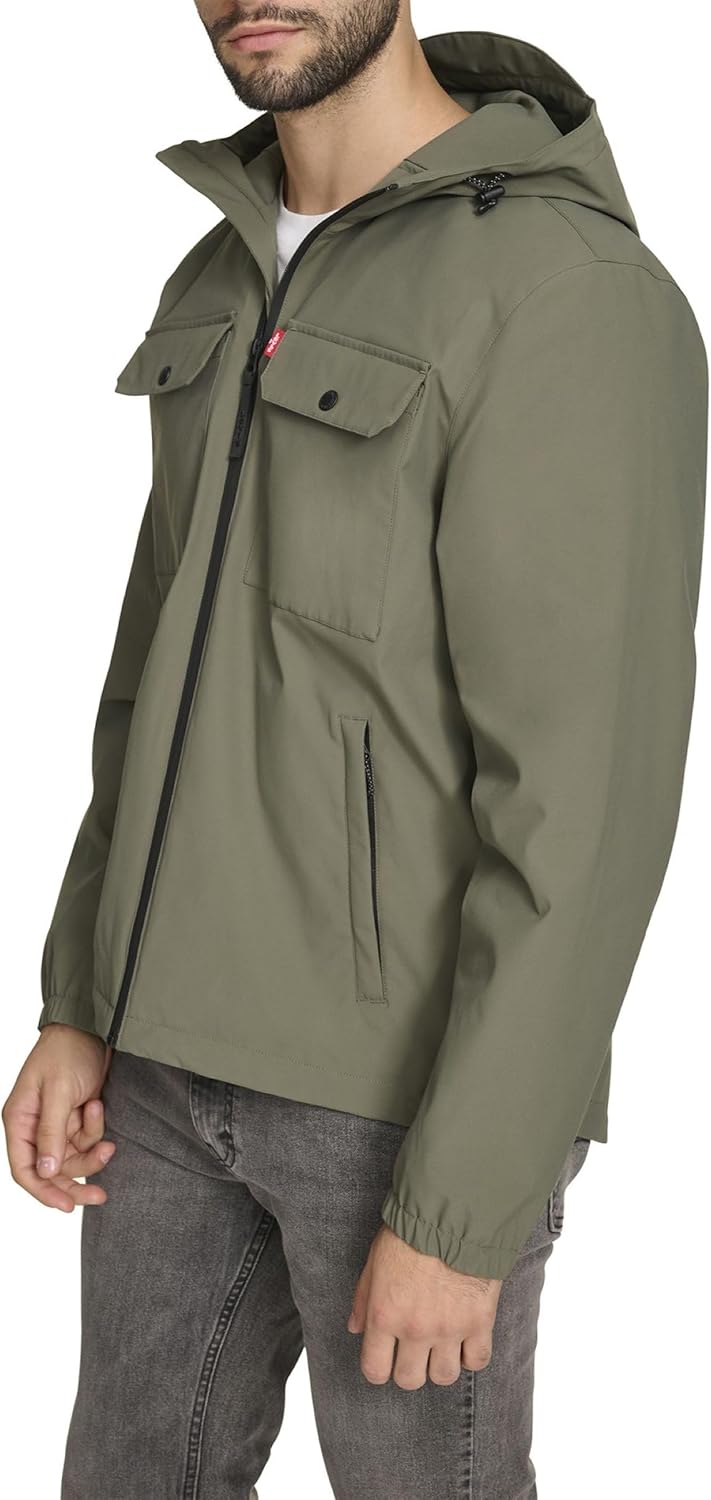 Levi's four pocket performance hooded rain jacket with two chest flap trucker pockets with snap closure and two lower welt pockets with zipper closure