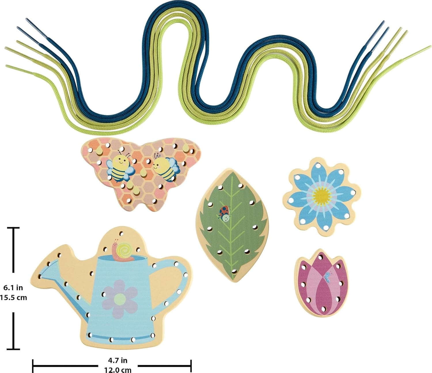 ​Garden-themed lacing activity set with 5 wooden cards and 5 colorful laces ​