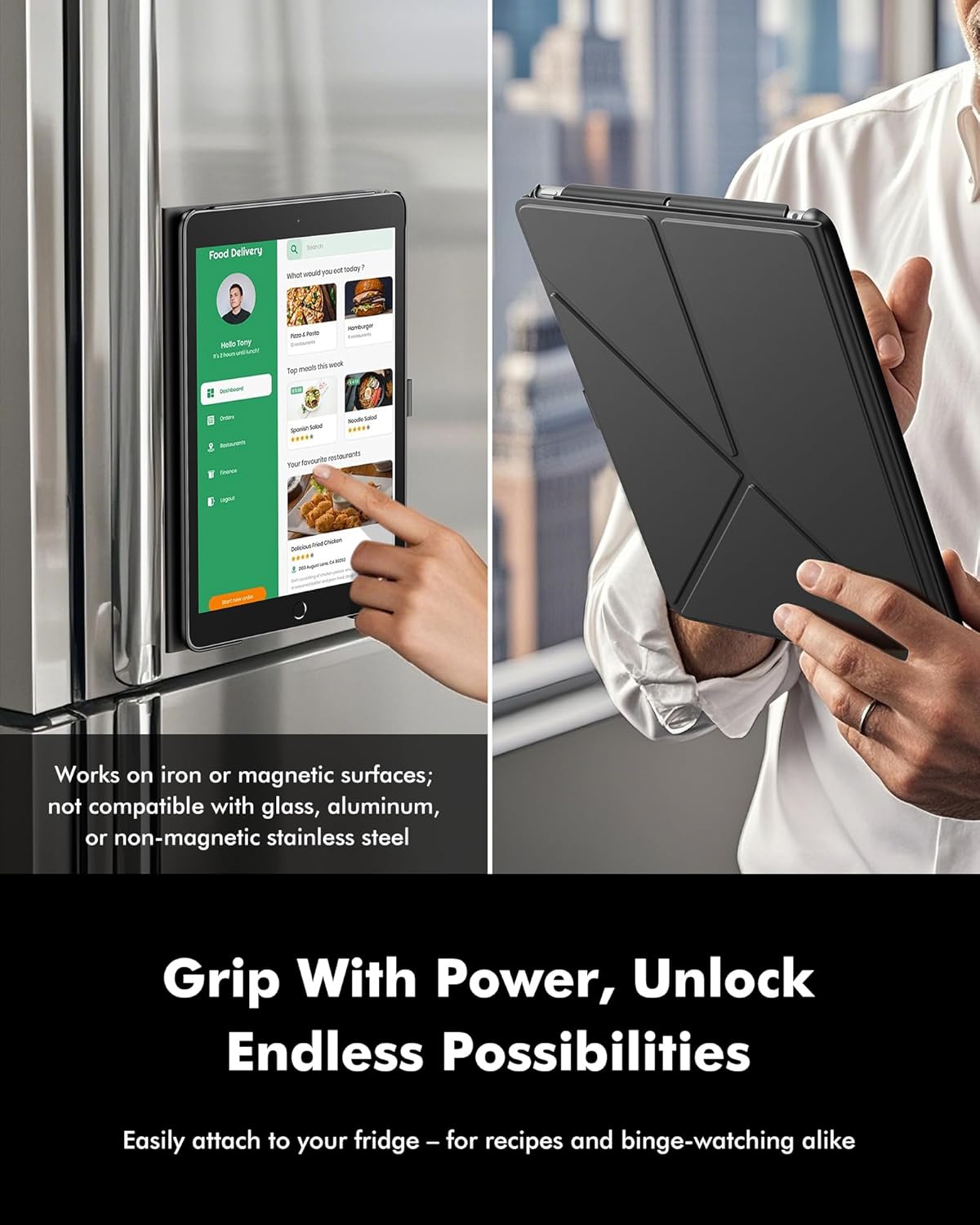 Ma𝗴𝗻𝗲𝘁𝗶𝗰 C𝗼𝘃𝗲𝗿 𝗳𝗼𝗿 Ha𝗻𝗱𝘀-F𝗿𝗲𝗲 C𝗼𝗻𝘃𝗲𝗻𝗶𝗲𝗻𝗰𝗲:The magnetic front cover securely attaches to the back, ensuring it doesn’t interfere with the screen. It can also stick to metal surfaces like refrigerators, making it ideal for multitasking or following recipes hands-free. (Note: Works only on iron or iron-containing surfaces, not on glass, aluminum, or non-magnetic stainless steel.)