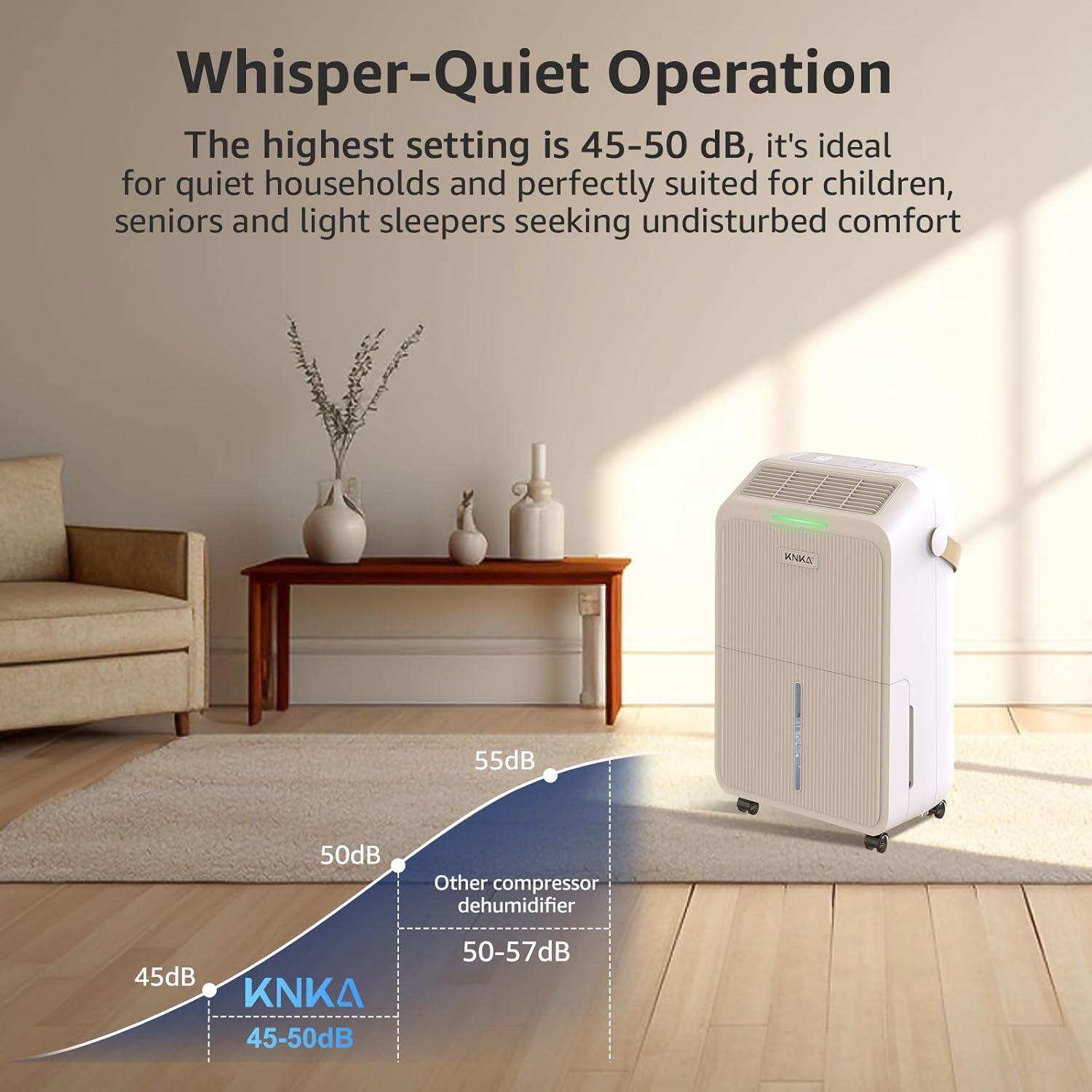 2500 Sq. Ft High-Efficiency Dehumidifier - The KNKA basement dehumidifier features a quiet, high-performance compressor that removes up to 34 pints of moisture per day (at 95°F, 90% RH). Ideal for basements, offices, bathrooms, bedrooms, kitchens, stockrooms, living rooms, laundry rooms, garages, crawlspaces, or RVs. It helps maintain optimal humidity between 50%-70% for healthier, more comfortable living