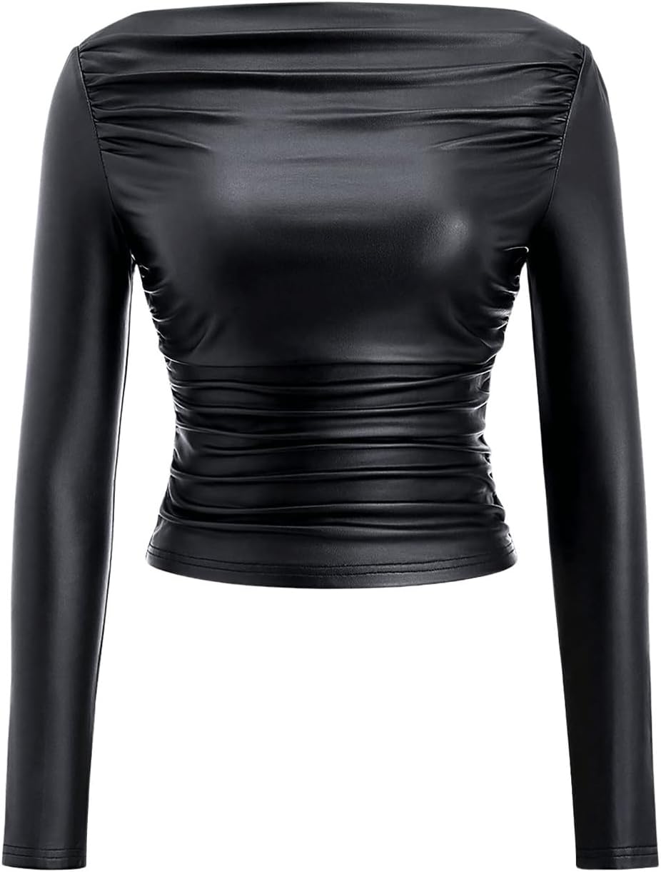 Floerns Women's PU Leather Long Sleeve Tee Shirts Ruched Boat Neck Y2k T Shirt