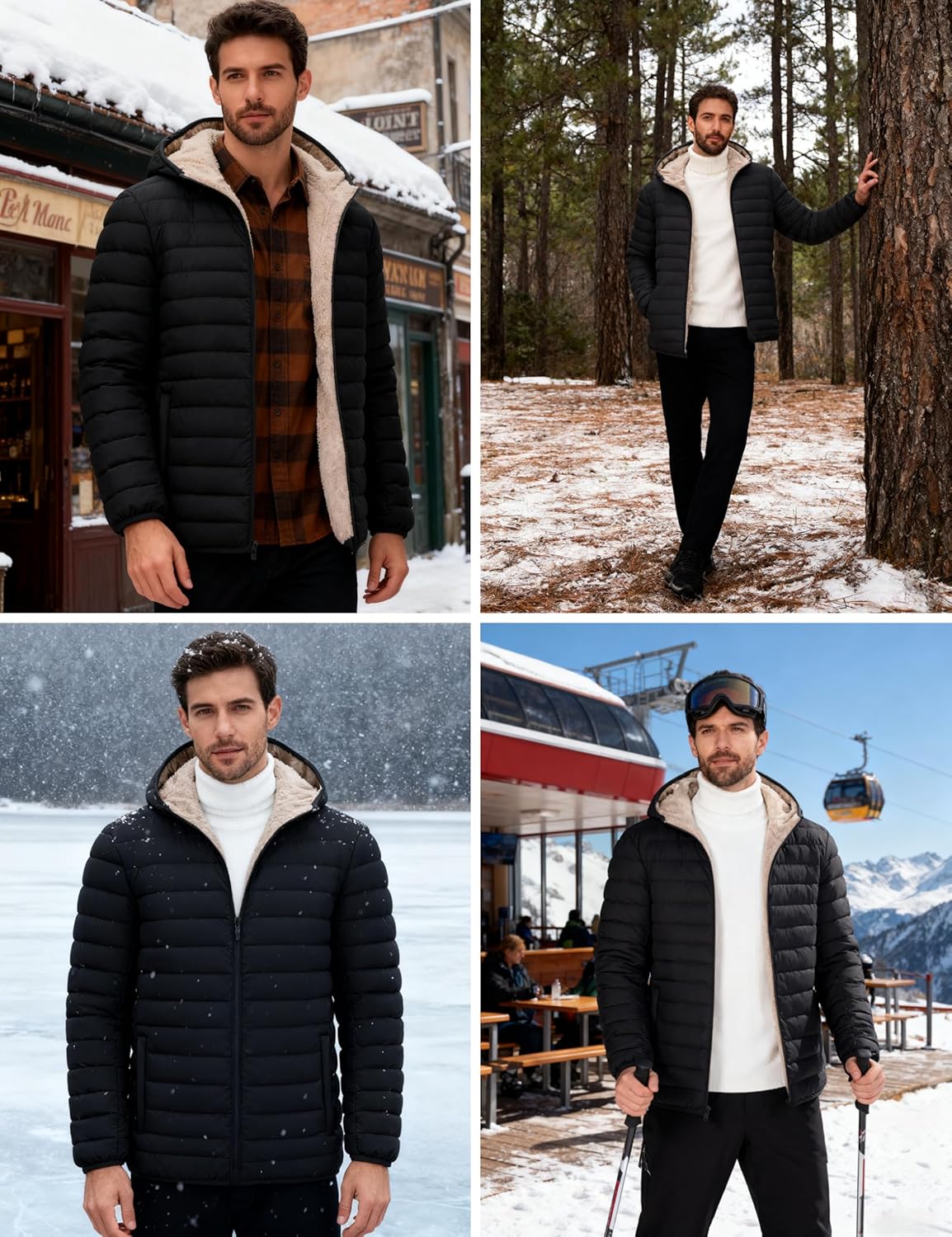 Cotrasen Mens Puffer Jacket Sherpa Lined Water Resistant Hooded Full Zip Mid-Weight Warm Insulated Winter Coat
