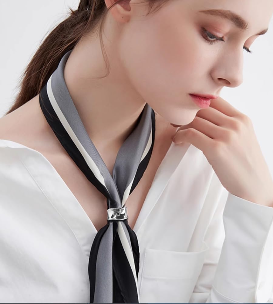 Add a touch of sophistication to your scarves and shawls with these elegant metallic rings. Available in three stunning finishes - silver, gold, and rose gold - these minimalist geometric clips bring both style and function to your wardrobe. The smooth, curved design prevents snags while securely holding your silk scarves, shawls, and wraps in place. Perfect for creating polished, professional looks or adding a refined accent to casual outfits. These versatile accessories work beautifully with various fabric types and thicknesses, from delicate silk to heavier knits. The dainty yet durable construction makes these rings ideal for daily wear, while their classic design ensures they'll remain stylish season after season. Transform your favorite scarves into eye-catching statement pieces with these sophisticated scarf rings.