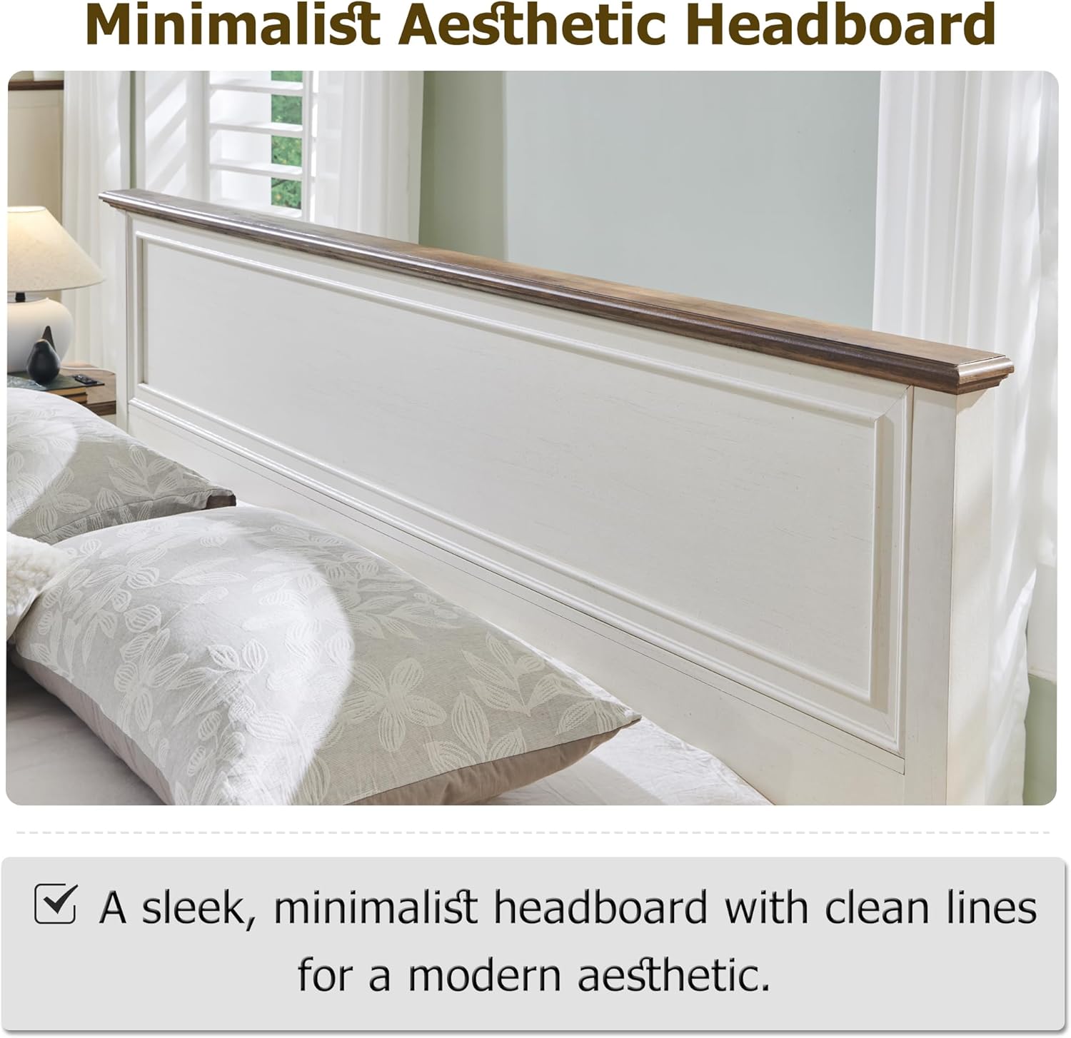Queen Size Bed Frame: Its Antique White finish gives it a weathered, vintage charm that's both sophisticated and inviting. The headboard is a beautiful focal point, featuring a clean lines and a minimalist design that complements the bed's overall aesthetic. Both stylish and supportive, making it perfect for lounging or propping yourself up while reading a book or watching TV.