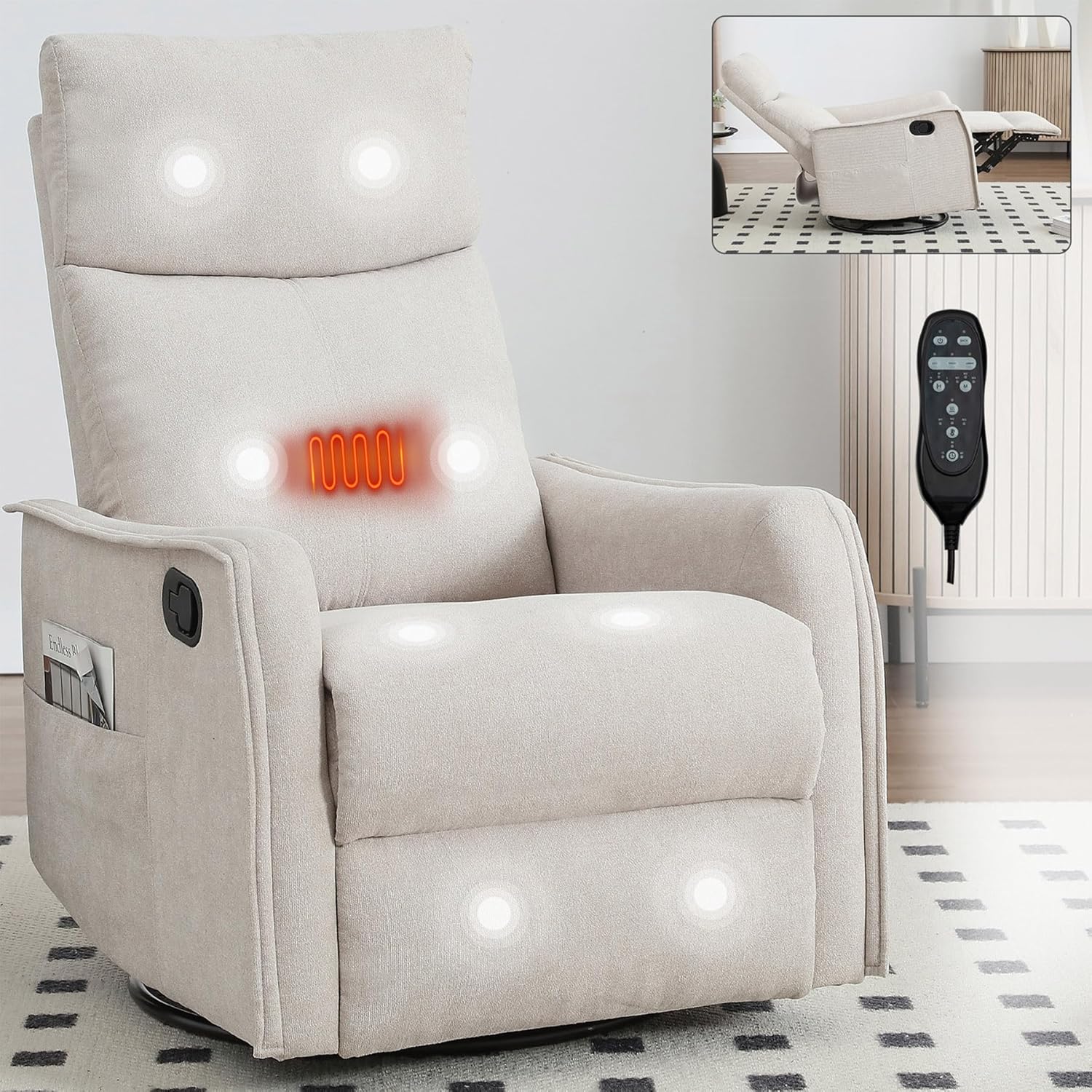 Massage Chair Recliner with Heat, Swivel Rocking Chair Recliner with High Back, Manual Lazy Boy Recliners for Adults,Small Recliner Chair for Small Spaces, Living Room Bedroom, Fabric (Beige)